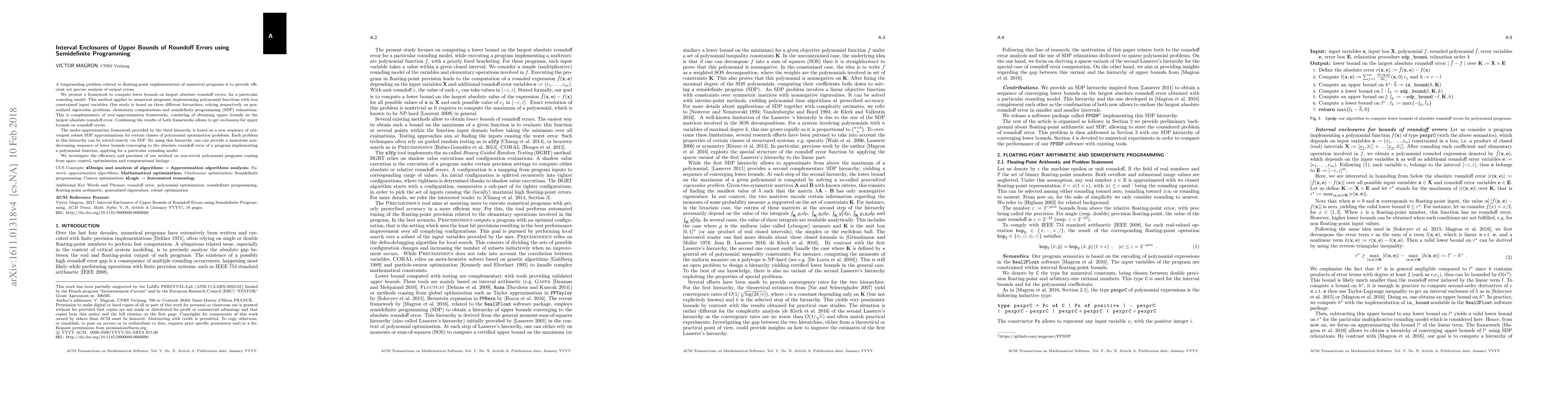 A longstanding problem related to floating-point implementation of numerical programs is to provide efficient yet precise analysis of output errors. We present a framework to compute lower bounds on largest absolute roundoff errors, for a particular rounding model. This method applies to numerical programs implementing polynomial functions with box constrained input variables. Our study is based on three different hierarchies, relying respectively on generalized eigenvalue problems, elementary computations and semidefinite programming (SDP) relaxations. This is complementary of over-approximation frameworks, consisting of obtaining upper bounds on the largest absolute roundoff error. Combining the results of both frameworks allows to get enclosures for upper bounds on roundoff errors. The under-approximation framework provided by the third hierarchy is based on a new sequence of convergent robust SDP approximations for certain classes of polynomial optimization problems. Each problem in this hierarchy can be solved exactly via SDP. By using this hierarchy, one can provide a monotone non-decreasing sequence of lower bounds converging to the absolute roundoff error of a program implementing a polynomial function, applying for a particular rounding model. We investigate the efficiency and precision of our method on non-trivial polynomial programs coming from space control, optimization and computational biology.