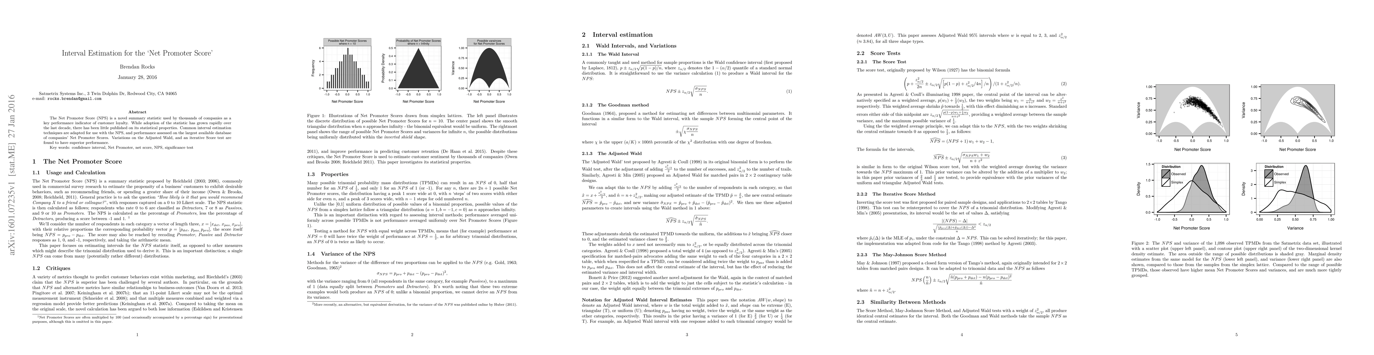 This paper adapts common interval estimation techniques for the Net Promoter Score (NPS), a key customer loyalty metric, and evaluates their performance using a large database of NPS data. The study finds that variations of the Adjusted Wald and iterative Score test provide superior interval estimation accuracy for NPS.