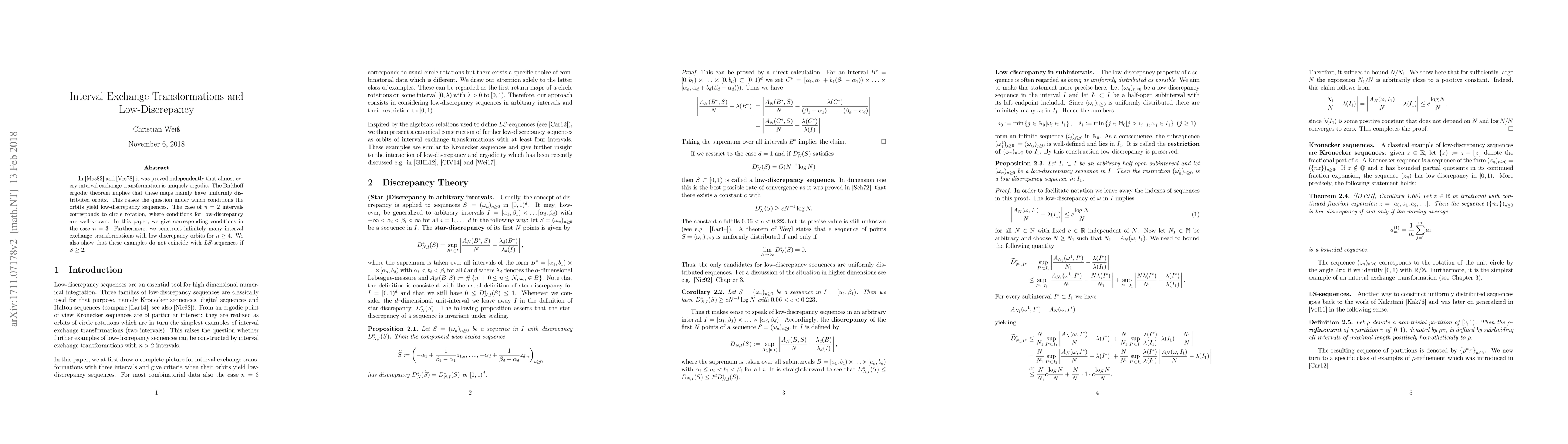 This research paper proves conditions for low-discrepancy orbits in interval exchange transformations with n=3 intervals and constructs infinitely many such transformations for n≥4. It also distinguishes these examples from $LS$-sequences when S≥2.