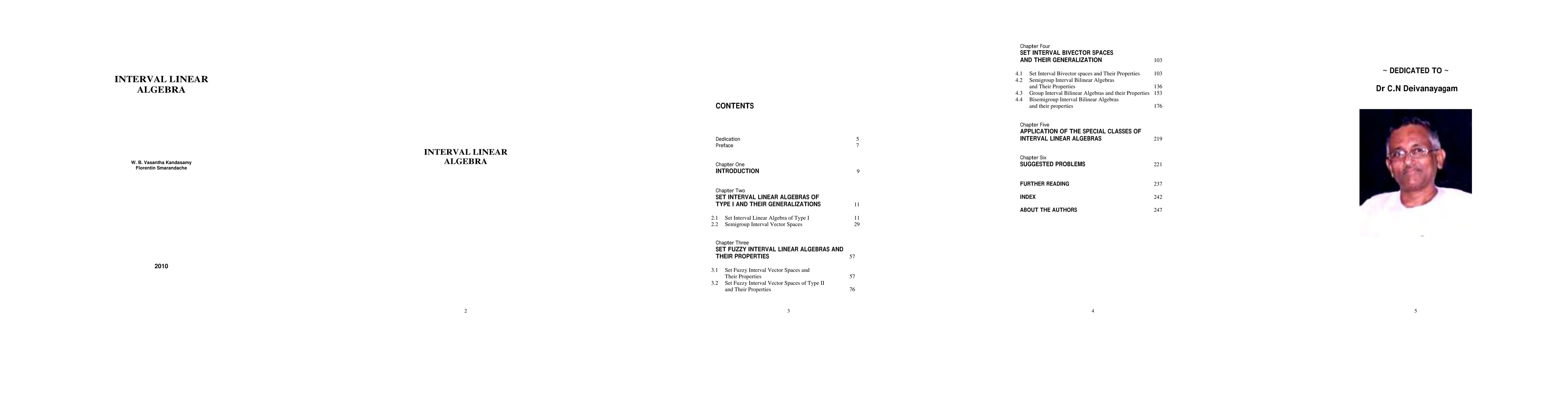 This book systematically develops interval linear algebra using special types of intervals, focusing on interval vector spaces and polynomials over various sets. It includes over 350 examples and covers topics from set interval linear algebras to interval linear bialgebras, concluding with nearly 110 problems.