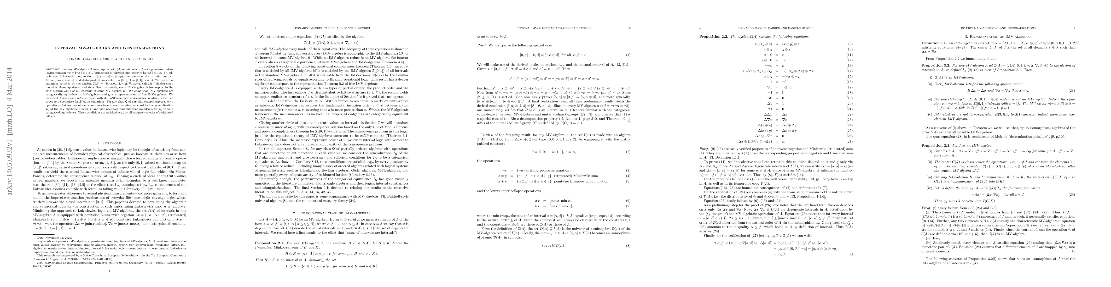 For any MV-algebra $A$ we equip the set $I(A)$ of intervals in $A$ with pointwise \L ukasiewicz negation $\neg x=\{\neg \alpha\mid \alpha\in x\}$, (truncated) Minkowski sum, $x\oplus y=\{\alpha\oplus \beta\mid \alpha \in x,\,\,\beta\in y\}$, pointwise \L ukasiewicz conjunction $x\odot y=\neg(\neg x\oplus \neg y)$, the operators $\Delta x=[\min x,\min x]$, $\nabla x=[\max x,\max x]$, and distinguished constants $0=[0,0],\,\, 1=[1,1],\,\,\, \mathsf{i} = A$. We list a few equations satisfied by the algebra $\mathcal I(A)=(I(A),0,1,\mathsf{i},\neg,\Delta,\nabla,\oplus,\odot)$, call IMV-algebra every model ofthese equations, and show that, conversely, every IMV-algebra is isomorphic to the IMV-algebra $\mathcal I(B)$ of all intervals in some MV-algebra $B$. We show that IMV-algebras are categorically equivalent to MV-algebras, and give a representation of free IMV-algebras. We construct \L ukasiewicz interval logic, with its coNP-complete consequence relation, which we prove to be complete for $\mathcal I([0,1])$-valuations. For any class $\mathsf{Q}$ of partially ordered algebras with operations that are monotone or antimonotone in each variable, we consider the generalization $\mathcal I_{\mathsf{Q}}$ of the MV-algebraic functor $\mathcal I$, and give necessary and sufficient conditions for $\mathcal I_{\mathsf{Q}}$ to be a categorical equivalence. These conditions are satisfied, e.g., by all subquasivarieties of residuated lattices.