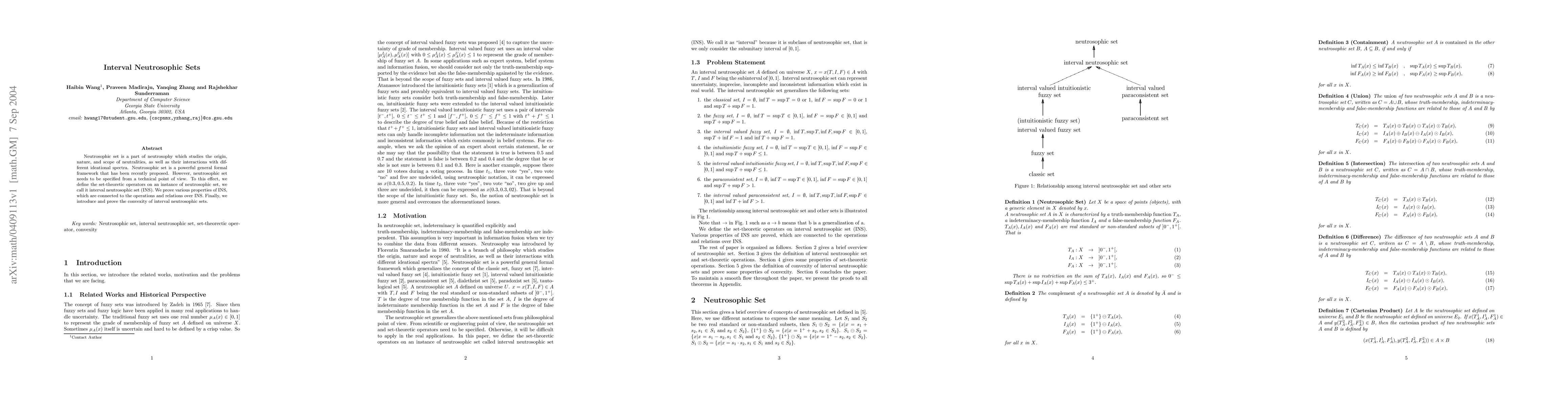 This paper introduces interval neutrosophic sets as a formal framework for studying neutralities and their interactions with different ideational spectra. It proves properties of these sets, including convexity, and provides a technical specification for the set-theoretic operators on INS.
