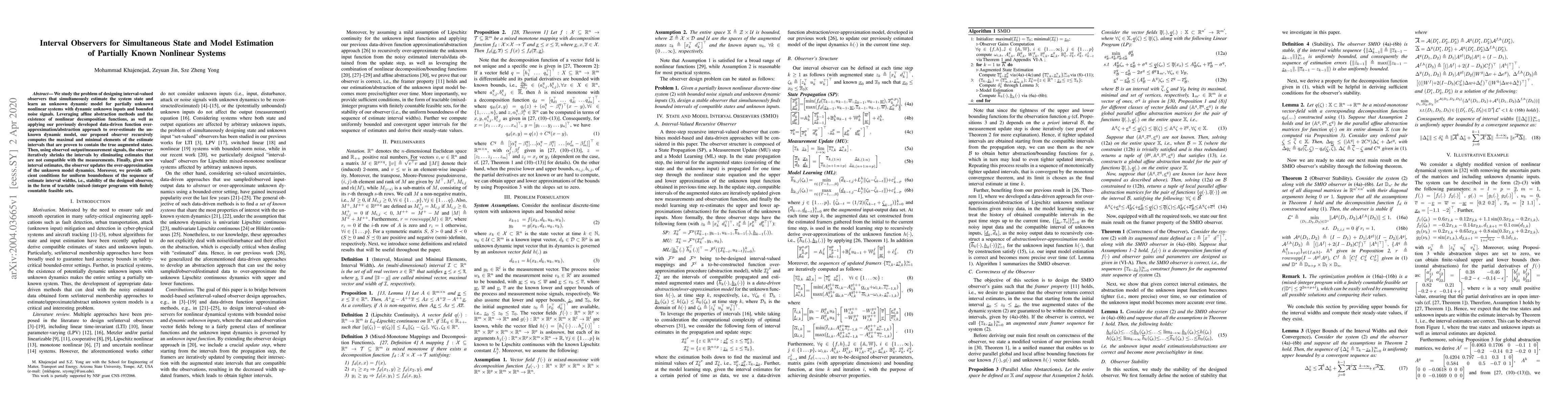 This paper proposes interval-valued observers to simultaneously estimate the state and model of partially unknown nonlinear systems, incorporating dynamic unknown inputs and bounded noise. The observer iteratively shrinks estimate intervals using measurement data and updates the model over-approximation, ensuring stability through tractable integer programs.