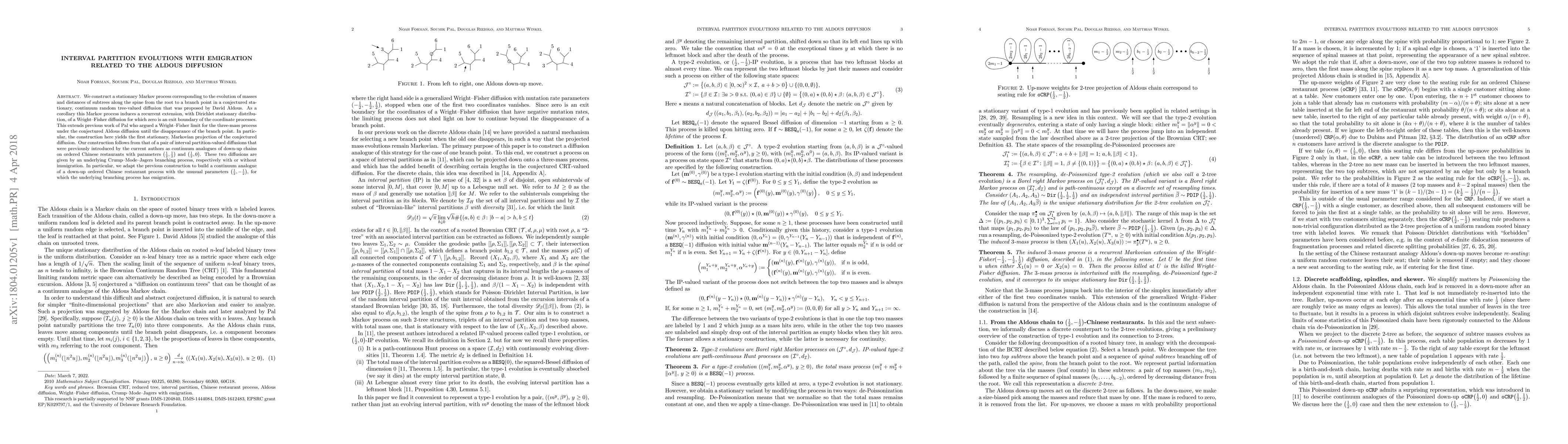 We construct a stationary Markov process corresponding to the evolution of masses and distances of subtrees along the spine from the root to a branch point in a conjectured stationary, continuum random tree-valued diffusion that was proposed by David Aldous. As a corollary this Markov process induces a recurrent extension, with Dirichlet stationary distribution, of a Wright-Fisher diffusion for which zero is an exit boundary of the coordinate processes. This extends previous work of Pal who argued a Wright-Fisher limit for the three-mass process under the conjectured Aldous diffusion until the disappearance of the branch point. In particular, the construction here yields the first stationary, Markovian projection of the conjectured diffusion. Our construction follows from that of a pair of interval partition-valued diffusions that were previously introduced by the current authors as continuum analogues of down-up chains on ordered Chinese restaurants with parameters (1/2,1/2) and (1/2,0). These two diffusions are given by an underlying Crump-Mode-Jagers branching process, respectively with or without immigration. In particular, we adapt the previous construction to build a continuum analogue of a down-up ordered Chinese restaurant process with the unusual parameters (1/2,-1/2), for which the underlying branching process has emigration.