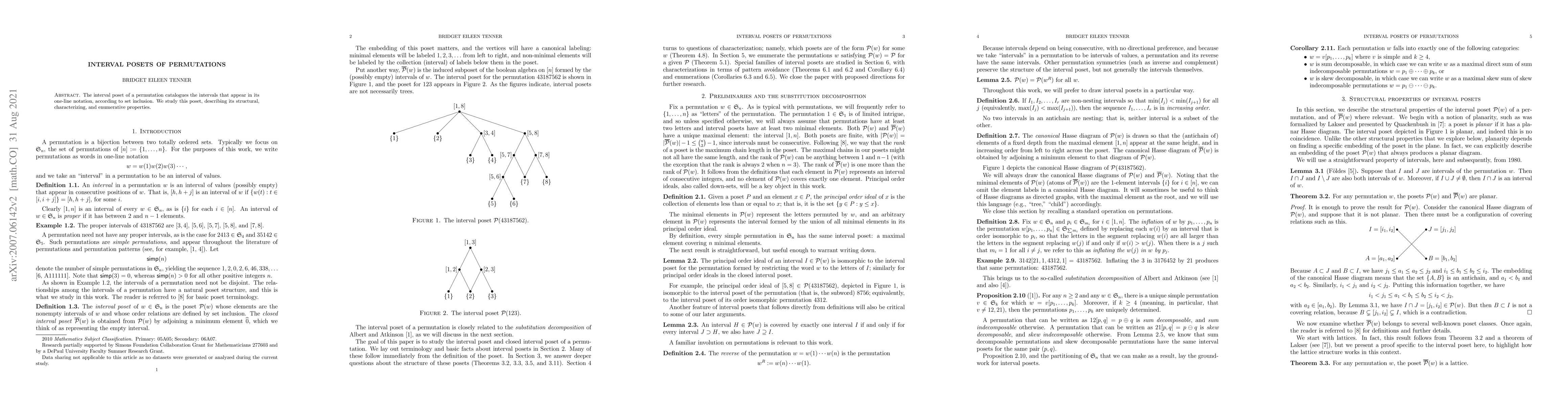 Summary: This paper investigates the interval posets of permutations, detailing their structural, characterizing, and enumerative properties, which catalog the set inclusions of intervals in the permutation's one-line notation.