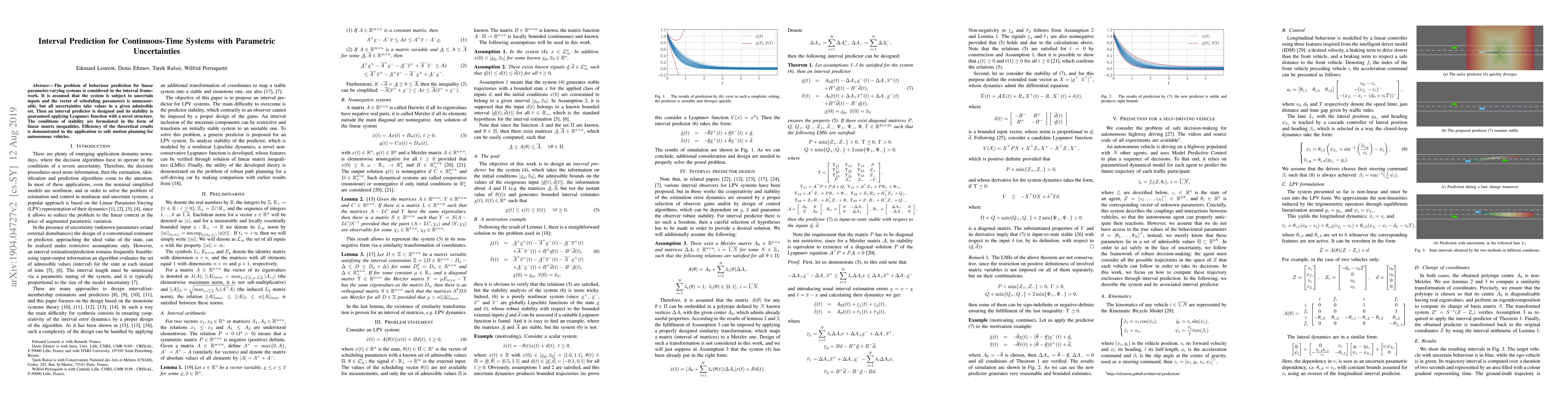 This paper develops an interval predictor for linear parameter-varying systems with parametric uncertainties, ensuring stability through linear matrix inequalities, with applications in safe motion planning for autonomous vehicles.