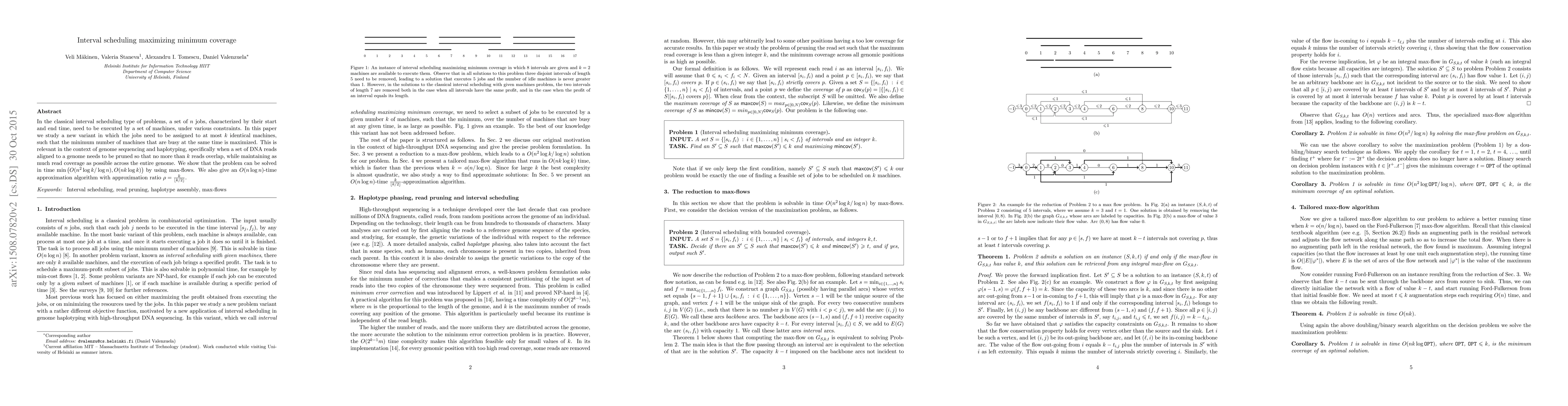 This paper introduces an interval scheduling problem where jobs are assigned to at most k identical machines to maximize minimum coverage, with applications in genome sequencing. It presents a time-efficient solution using max-flows and an approximation algorithm with a guaranteed ratio.
