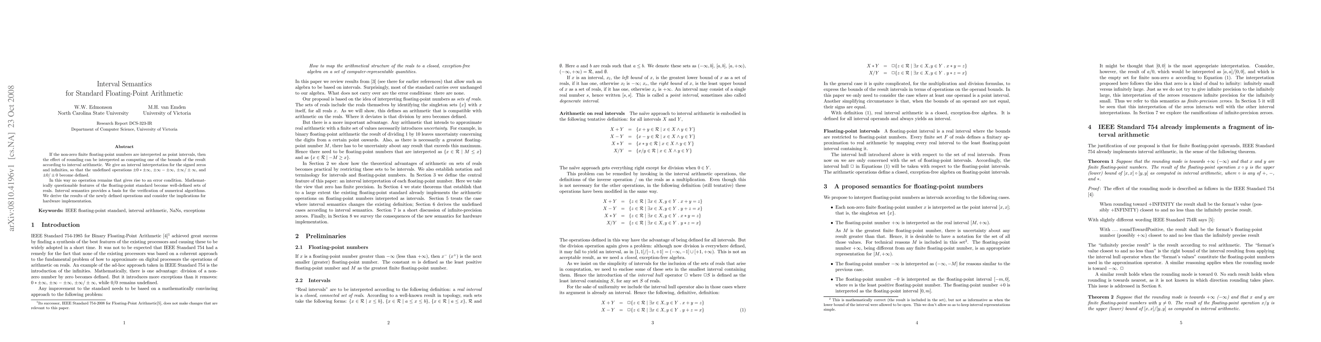 This paper proposes an interval semantics approach for standard floating-point arithmetic, defining signed zeros and infinities to handle undefined operations and eliminate error conditions. This method offers a framework for verifying numerical algorithms and explores its implications for hardware implementation.