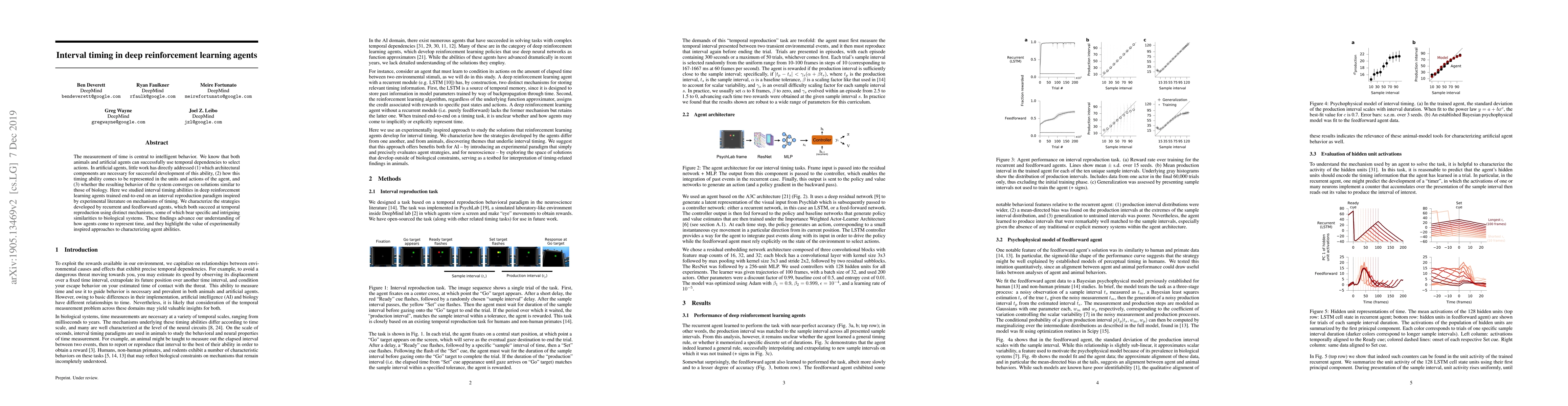 This paper investigates interval timing in deep reinforcement learning agents, finding that both recurrent and feedforward architectures develop distinct yet biologically plausible strategies for temporal reproduction. The study enhances our understanding of how artificial agents represent time and underscores the importance of experimentally inspired approaches in evaluating agent capabilities.