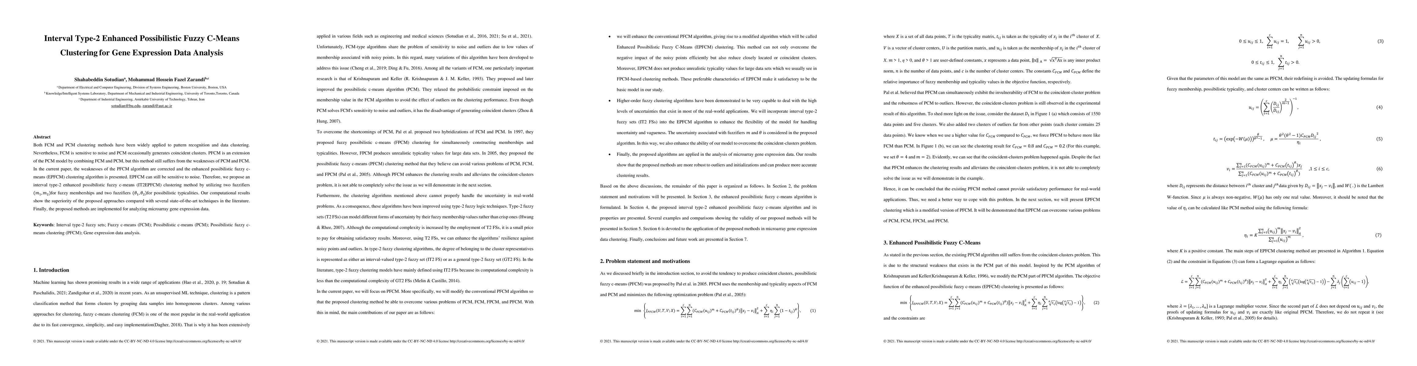 This paper proposes an interval type-2 enhanced possibilistic fuzzy c-means clustering (IT2EPFCM) method to improve gene expression data analysis, addressing the noise sensitivity and cluster coincidence issues in existing FCM and PCM clustering techniques. The results demonstrate superior performance over state-of-the-art methods.