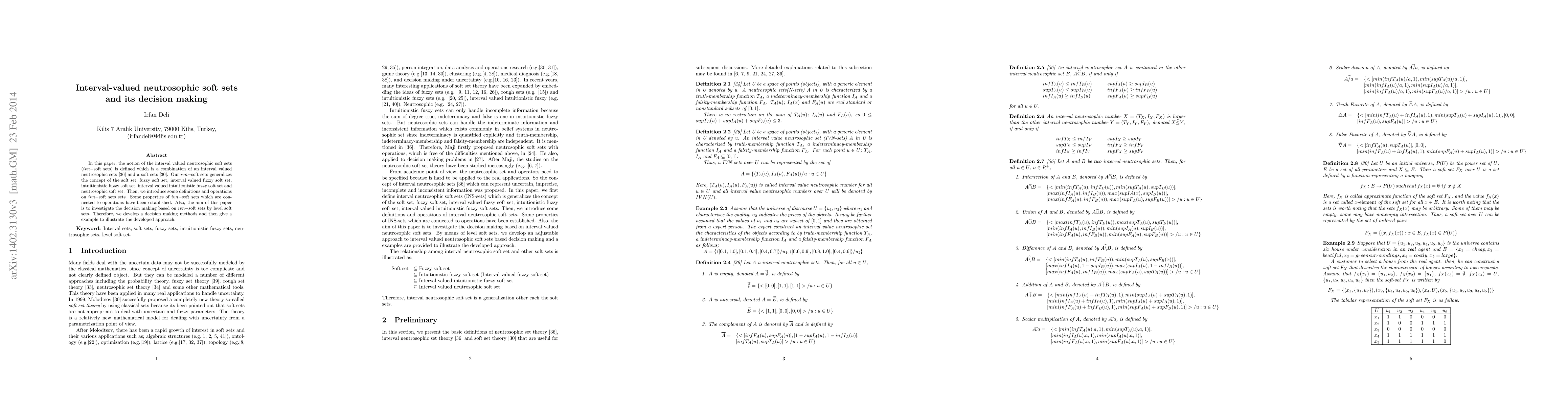 This paper introduces interval-valued neutrosophic soft sets, combining interval-valued neutrosophic sets and soft sets, and generalizes several existing soft set concepts. It develops decision-making methods based on these sets, illustrated with an example.