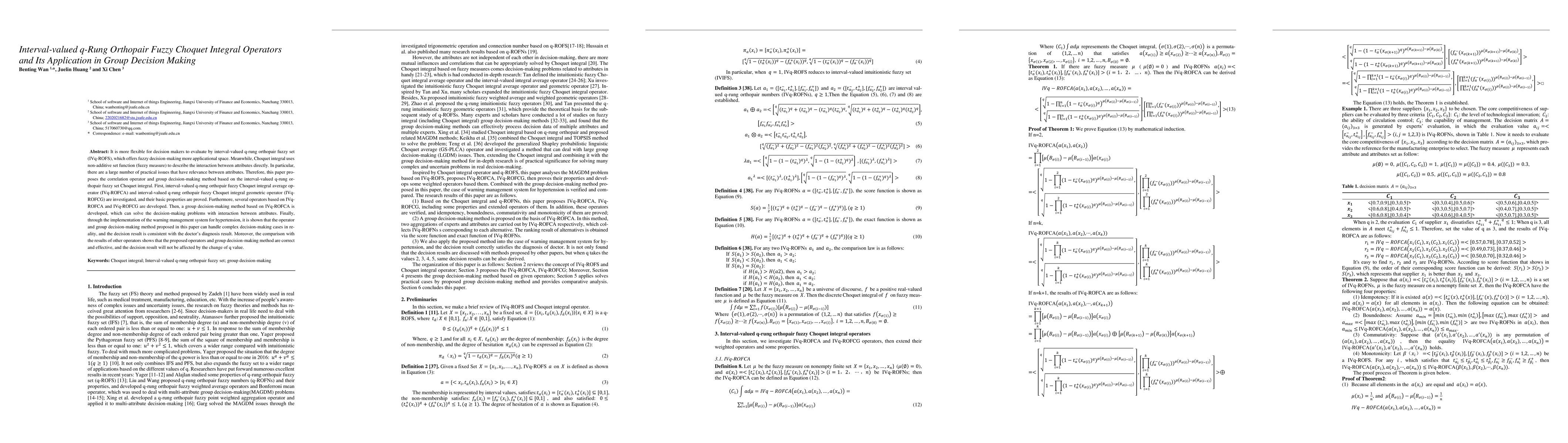 It is more flexible for decision makers to evaluate by interval-valued q-rung orthopair fuzzy set (IVq-ROFS),which offers fuzzy decision-making more applicational space. Meanwhile, Choquet integralses non-additive set function (fuzzy measure) to describe the interaction between attributes directly.In particular, there are a large number of practical issues that have relevance between attributes.Therefore,this paper proposes the correlation operator and group decision-making method based on the interval-valued q-rung orthopair fuzzy set Choquet integral.First,interval-valued q-rung orthopair fuzzy Choquet integral average operator (IVq-ROFCA) and interval-valued q-rung orthopair fuzzy Choquet integral geometric operator (IVq-ROFCG) are inves-tigated,and their basic properties are proved.Furthermore, several operators based on IVq-ROFCA and IVq-ROFCG are developed. Then, a group decision-making method based on IVq-ROFCA is developed,which can solve the decision making problems with interaction between attributes.Finally,through the implementation of the warning management system for hypertension,it is shown that the operator and group decision-making method proposed in this paper can handle complex decision-making cases in reality, and the decision result is consistent with the doctor's diagnosis result.Moreover,the comparison with the results of other operators shows that the proposed operators and group decision-making method are correct and effective,and the decision result will not be affected by the change of q value.