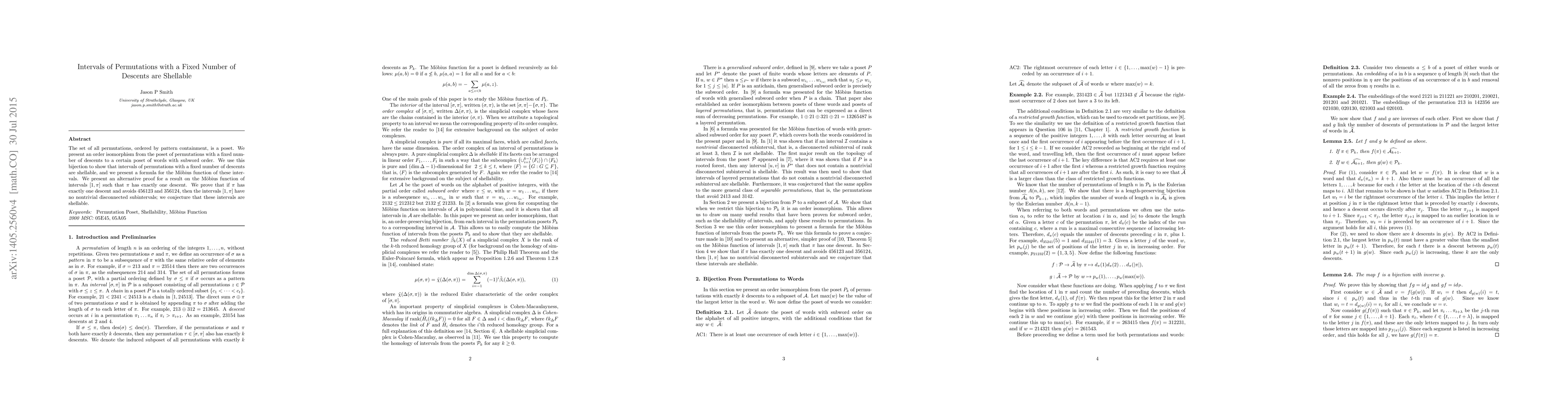 This paper establishes an order isomorphism between permutations with a fixed number of descents and a poset of words, proving that such permutation intervals are shellable and providing a formula for their M\"obius function. It also conjectures shellability for specific permutation intervals with one descent.