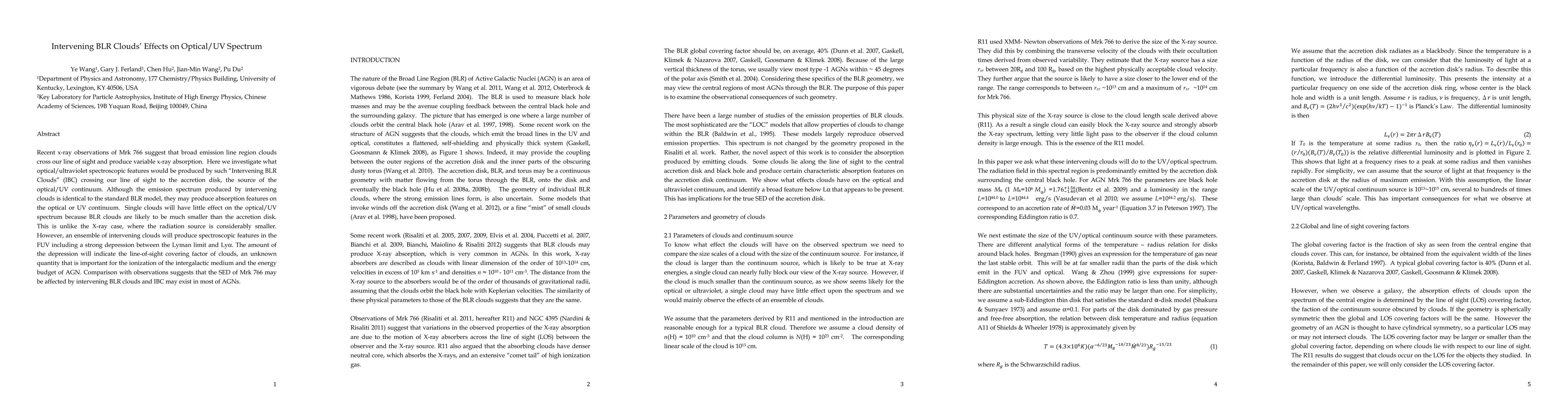 This paper investigates the optical/UV spectroscopic features caused by "Intervening BLR Clouds" (IBC) crossing the line of sight to the accretion disk, finding that while single clouds have minimal effect, an ensemble of IBC can produce significant FUV absorption features, indicating the line-of-sight covering factor of these clouds.