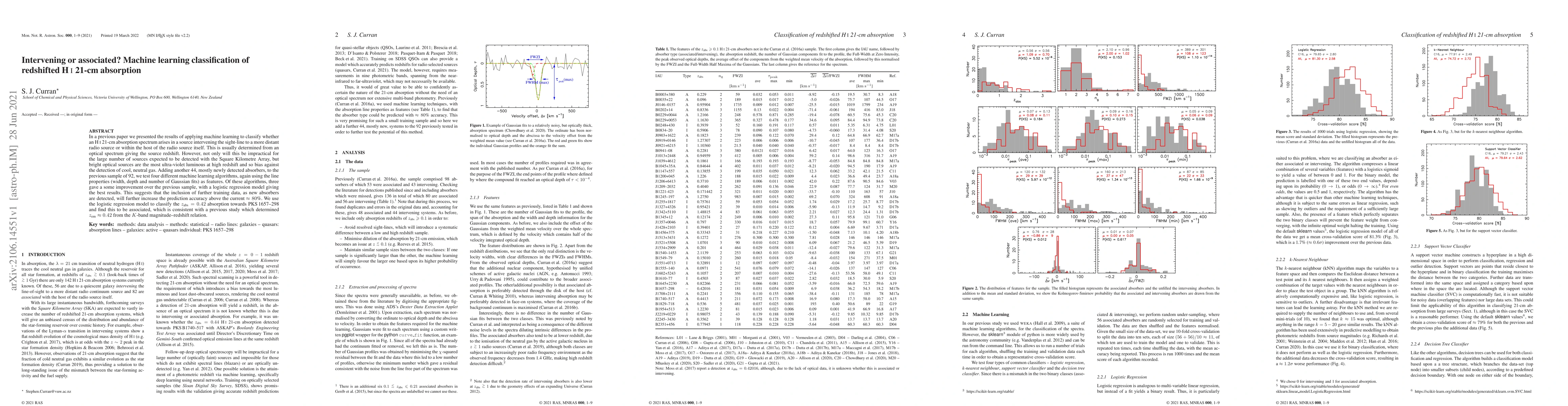 In a previous paper we presented the results of applying machine learning to classify whether an HI 21-cm absorption spectrum arises in a source intervening the sight-line to a more distant radio source or within the host of the radio source itself. This is usually determined from an optical spectrum giving the source redshift. However, not only will this be impractical for the large number of sources expected to be detected with the Square Kilometre Array, but bright optical sources are the most ultra-violet luminous at high redshift and so bias against the detection of cool, neutral gas. Adding another 44, mostly newly detected absorbers, to the previous sample of 92, we test four different machine learning algorithms, again using the line properties (width, depth and number of Gaussian fits) as features. Of these algorithms, three gave a some improvement over the previous sample, with a logistic regression model giving the best results. This suggests that the inclusion of further training data, as new absorbers are detected, will further increase the prediction accuracy above the current 80%. We use the logistic regression model to classify the z = 0.42 absorption towards PKS 1657-298 and find this to be associated, which is consistent with a previous study which determined a similar redshift from the K-band magnitude-redshift relation.