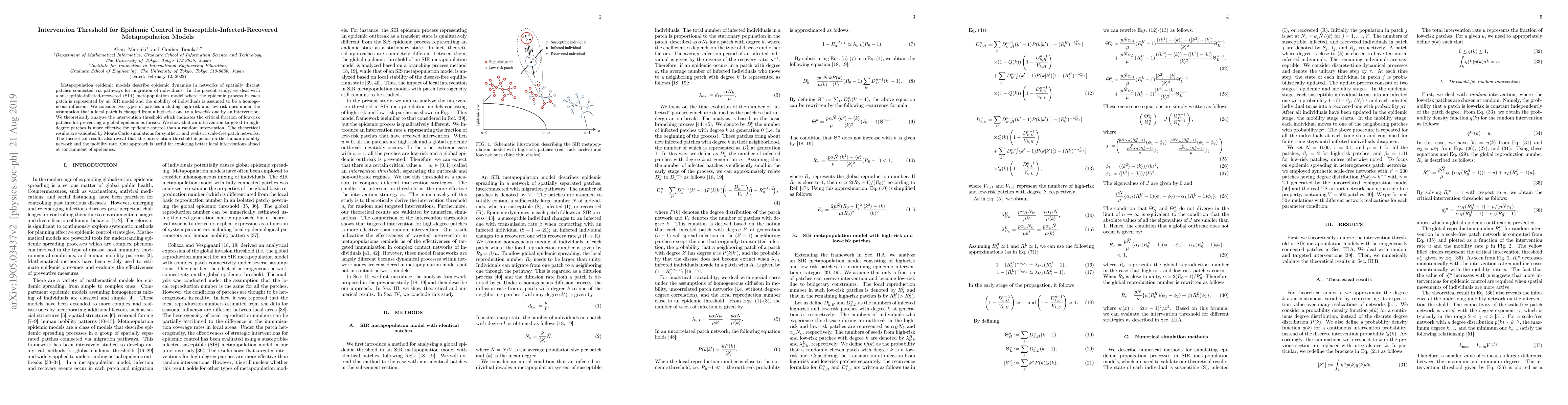 This paper investigates SIR metapopulation models to determine the optimal intervention threshold for epidemic control, focusing on high-risk and low-risk patches. The study finds that targeted intervention in high-degree patches is more effective than random intervention, validated through Monte Carlo simulations on synthetic and realistic networks.