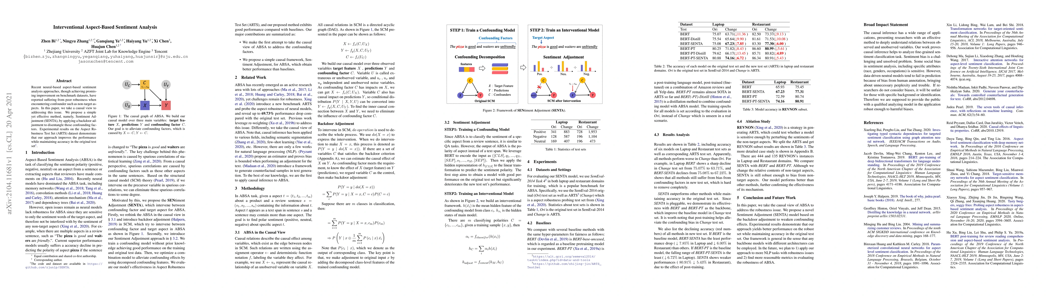 This paper proposes a method called Sentiment Adjustment (SENTA) to enhance the robustness of neural-based aspect-based sentiment analysis by disentangling confounding factors through backdoor adjustment. Experimental results show improved performance on a robustness test set while maintaining accuracy on the original test set.