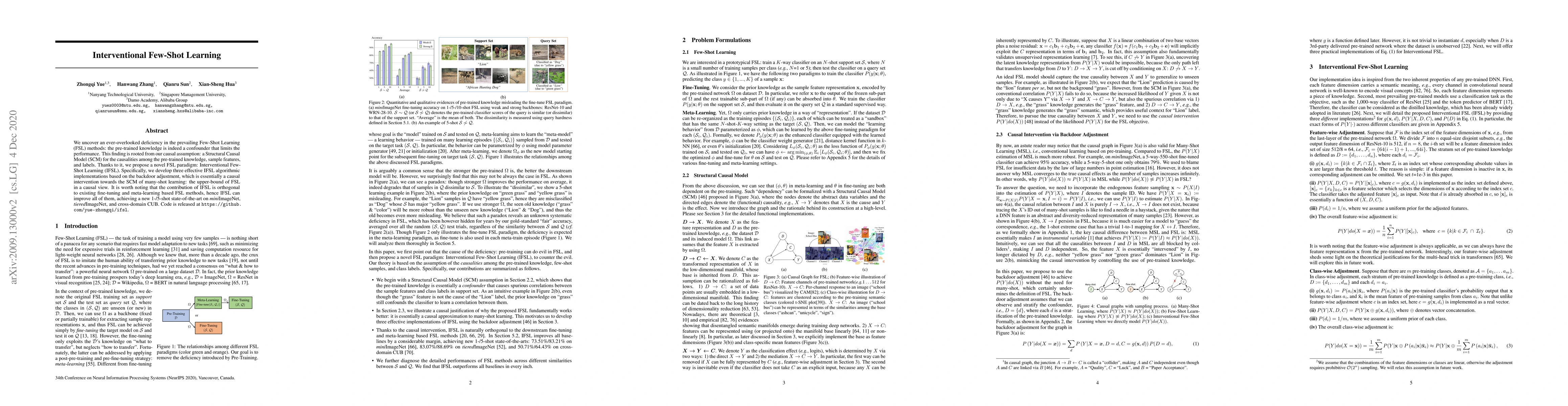 This paper identifies a limitation in existing Few-Shot Learning (FSL) methods where pre-trained knowledge acts as a confounder. It introduces Interventional Few-Shot Learning (IFSL), a novel paradigm based on Structural Causal Models, which proposes three algorithmic implementations to mitigate this issue, achieving state-of-the-art performance on several datasets.