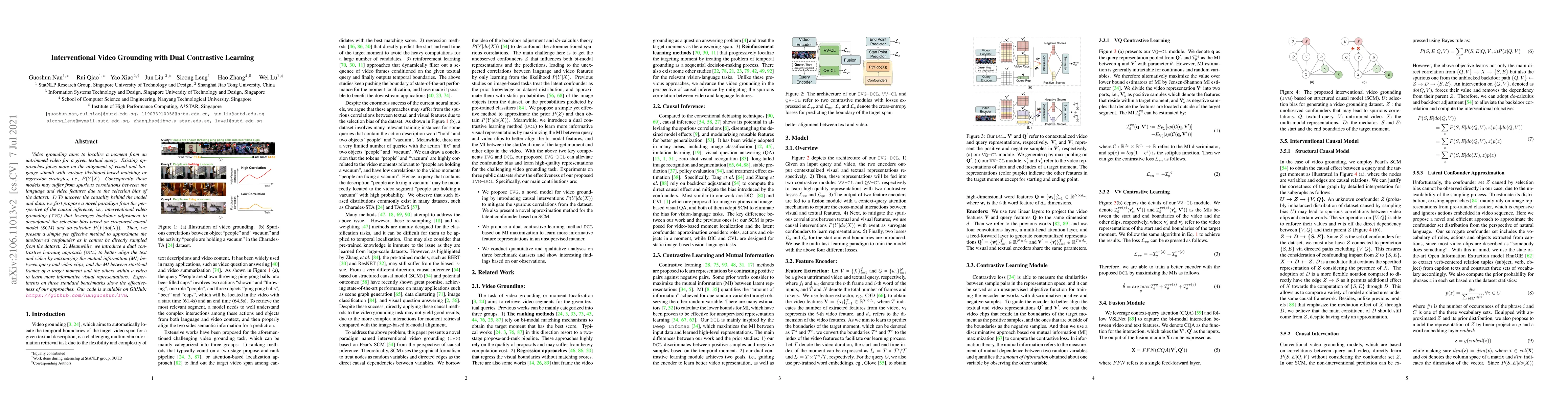 This paper proposes an interventional video grounding method that uses causal inference to deconfound selection bias and introduces a dual contrastive learning approach to better align text and video representations. Experiments demonstrate its effectiveness on standard benchmarks.