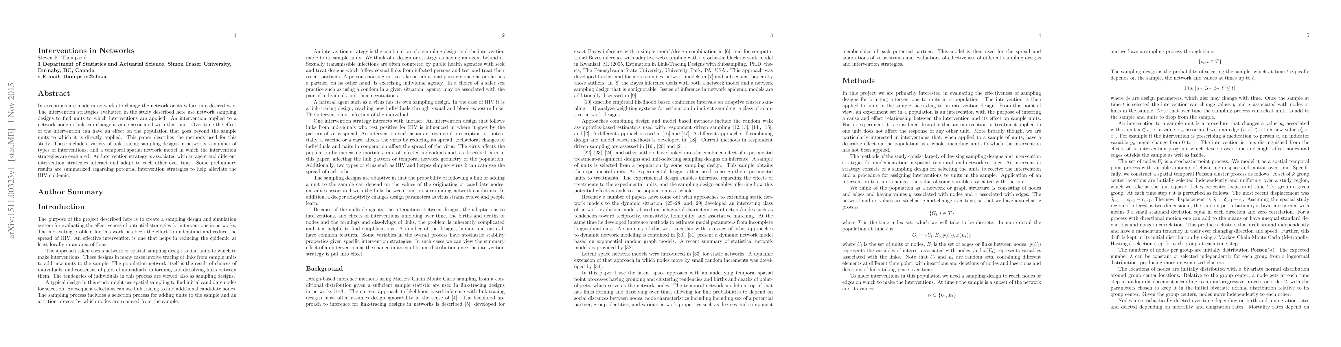 This study explores methods for interventions in networks to change network values and alleviate epidemics like HIV, using link-tracing sampling designs and a temporal spatial model. The research focuses on evaluating potential intervention strategies over time.