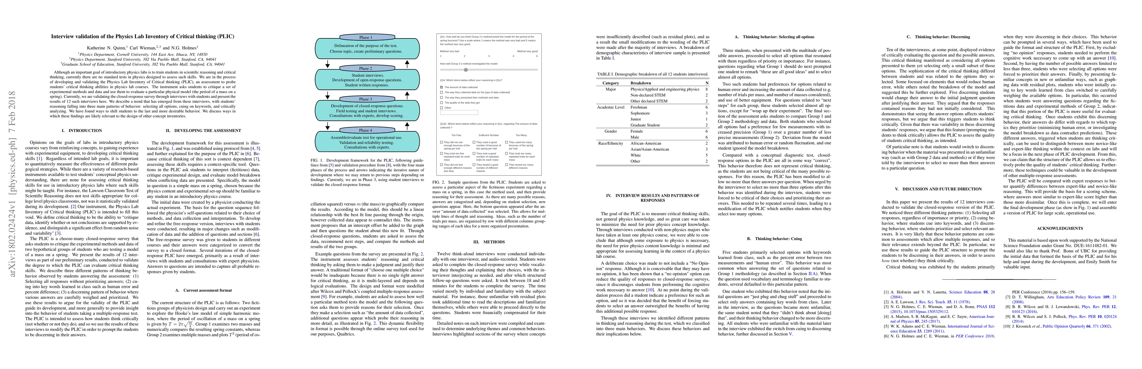 This paper develops and validates the Physics Lab Inventory of Critical thinking (PLIC) to assess students' critical thinking skills in physics labs. Through interviews, researchers identified three main student reasoning patterns and found methods to encourage more critical analysis, which could inform the design of other concept inventories.