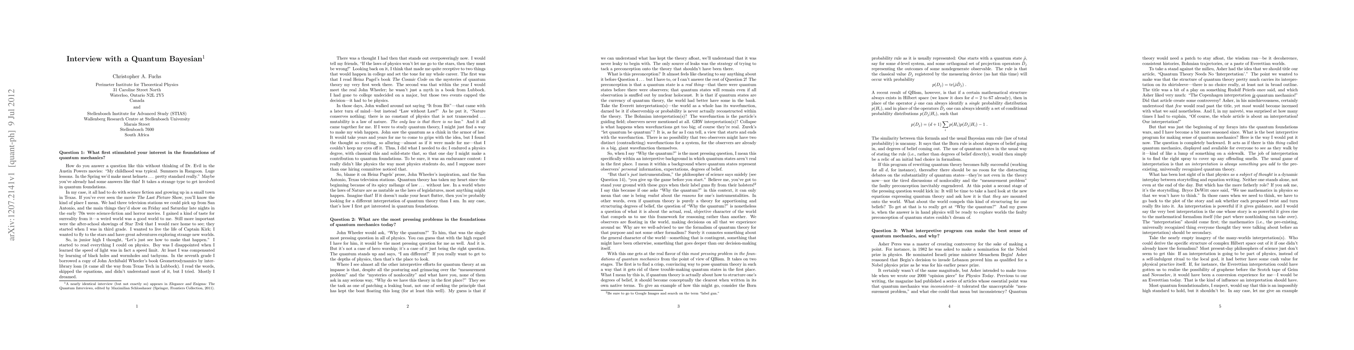 This paper collects into one place (most of) my answers to the questions Maximilian Schlosshauer posed in his interview volume, "Elegance and Enigma: The Quantum Interviews" (Springer, Frontiers Collection, 2011).