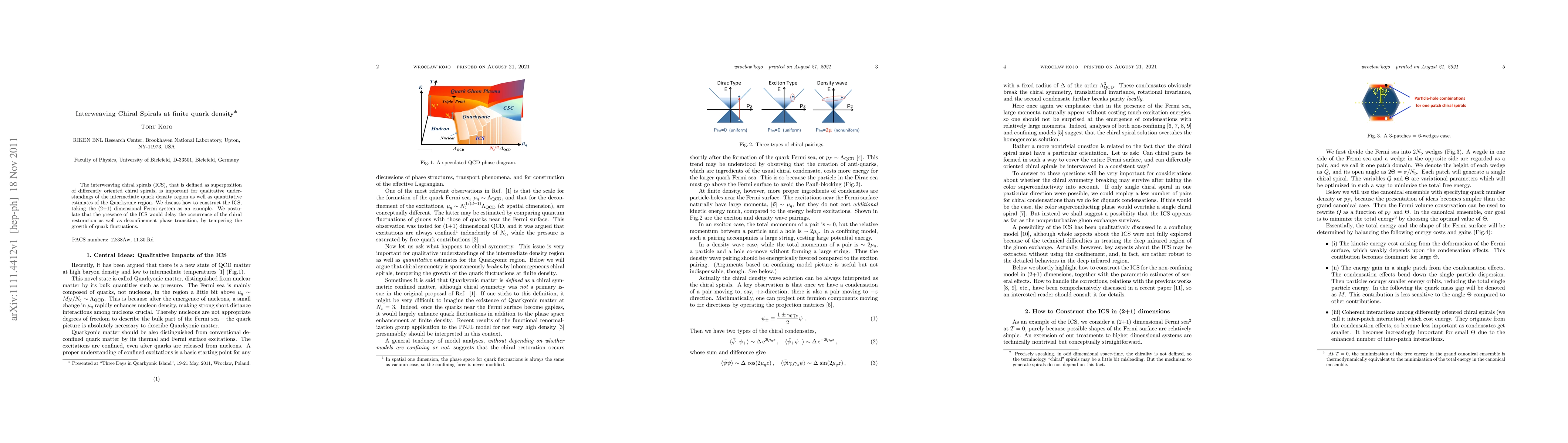 The interweaving chiral spirals (ICS), that is defined as superposition of differently oriented chiral spirals, is important for qualitative understandings of the intermediate quark density region as well as quantitative estimates of the Quarkyonic region. We discuss how to construct the ICS, taking the (2+1) dimensional Fermi system as an example. We postulate that the presence of the ICS would delay the occurrence of the chiral restoration as well as deconfinement phase transition, by tempering the growth of quark fluctuations.