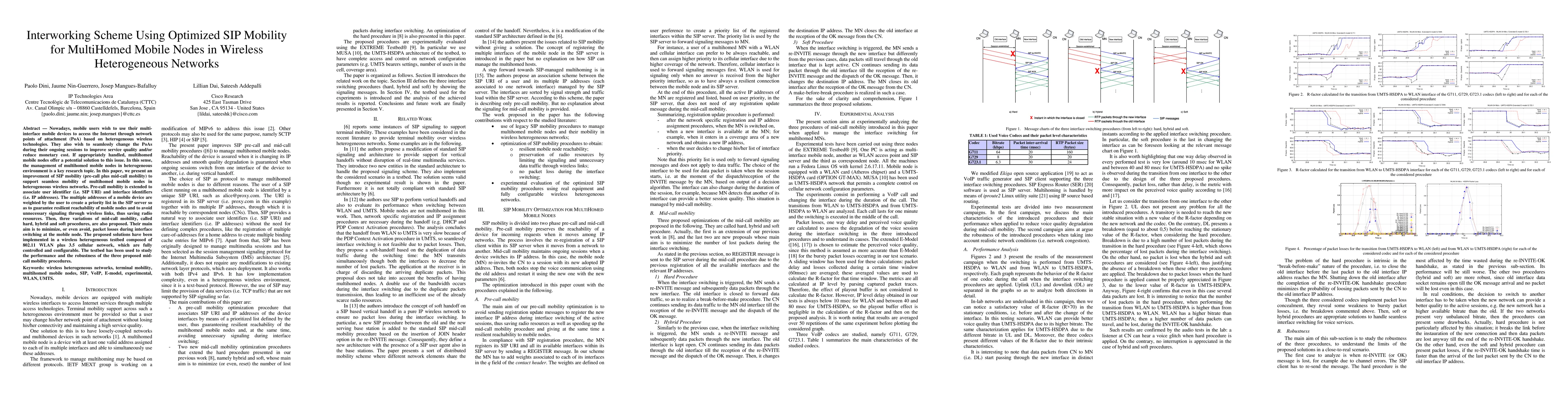 This paper proposes an optimized SIP mobility scheme to enable seamless mobility for multihomed mobile nodes in heterogeneous wireless networks. It introduces pre-call and mid-call mobility enhancements, including weighted priority lists for IP addresses and three mid-call mobility procedures to minimize packet loss during interface switching. The solutions were tested in a controlled testbed combining WLAN and 3.5G networks.