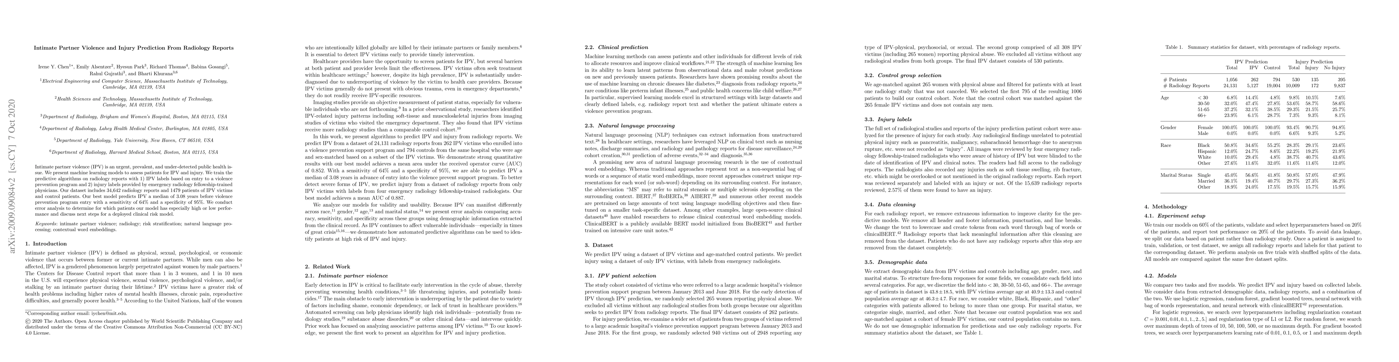 Intimate partner violence (IPV) is an urgent, prevalent, and under-detected public health issue. We present machine learning models to assess patients for IPV and injury. We train the predictive algorithms on radiology reports with 1) IPV labels based on entry to a violence prevention program and 2) injury labels provided by emergency radiology fellowship-trained physicians. Our dataset includes 34,642 radiology reports and 1479 patients of IPV victims and control patients. Our best model predicts IPV a median of 3.08 years before violence prevention program entry with a sensitivity of 64% and a specificity of 95%. We conduct error analysis to determine for which patients our model has especially high or low performance and discuss next steps for a deployed clinical risk model.