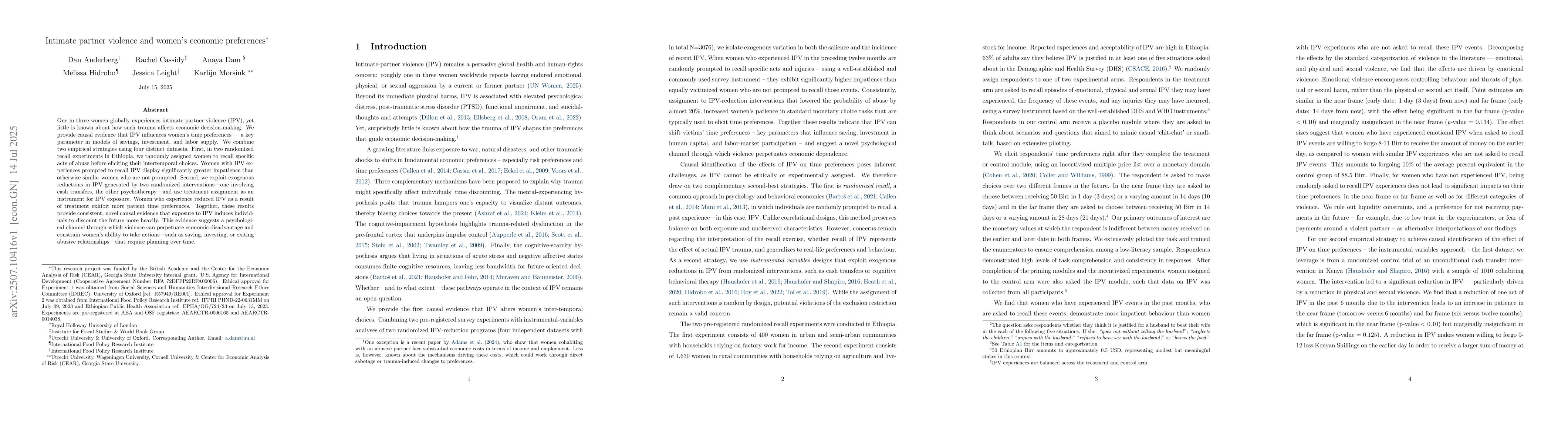 One in three women globally experiences intimate partner violence (IPV), yet little is known about how such trauma affects economic decision-making. We provide causal evidence that IPV influences women's time preferences - a key parameter in models of savings, investment, and labor supply. We combine two empirical strategies using four distinct datasets. First, in two randomized recall experiments in Ethiopia, we randomly assigned women to recall specific acts of abuse before eliciting their intertemporal choices. Women with IPV experiences prompted to recall IPV display significantly greater impatience than otherwise similar women who are not prompted. Second, we exploit exogenous reductions in IPV generated by two randomized interventions - one involving cash transfers, the other psychotherapy - and use treatment assignment as an instrument for IPV exposure. Women who experience reduced IPV as a result of treatment exhibit more patient time preferences. Together, these results provide consistent, novel causal evidence that exposure to IPV induces individuals to discount the future more heavily. This evidence suggests a psychological channel through which violence can perpetuate economic disadvantage and constrain women's ability to take actions - such as saving, investing, or exiting abusive relationships - that require planning over time.