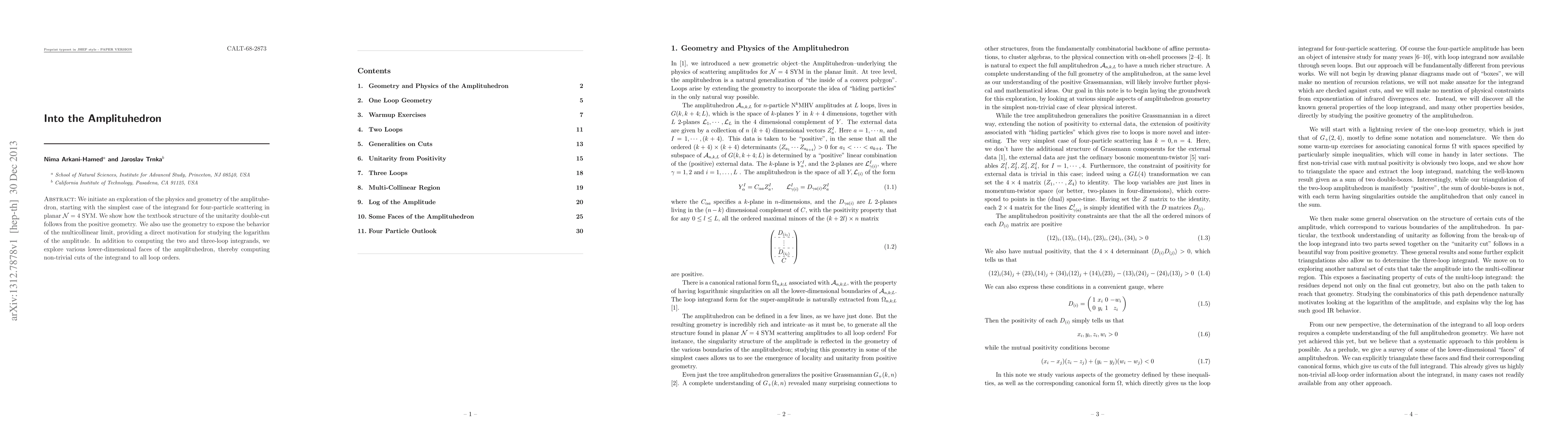 This paper initiates an investigation into the physics and geometry of the amplituhedron, demonstrating its connection to the unitarity double-cut in N=4 SYM scattering. It computes the two and three-loop integrands and explores lower-dimensional faces, revealing non-trivial cuts of the integrand to all loop orders.