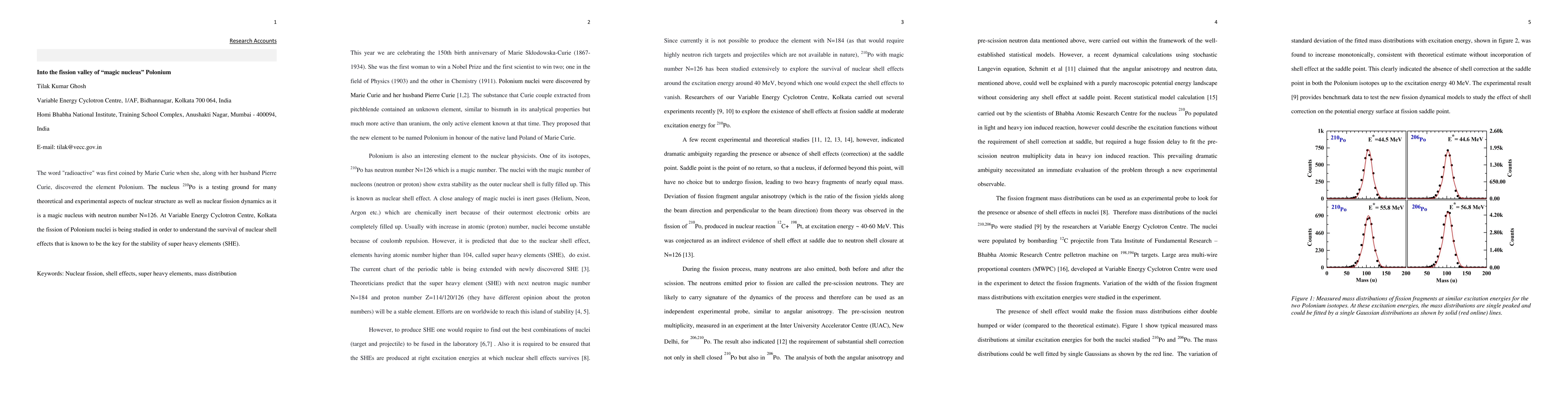 The word "radioactive" was first coined by Marie Curie when she, along with her husband Pierre Curie, discovered the element Polonium. The nucleus 210Po is a testing ground for many theoretical and experimental aspects of nuclear structure as well as nuclear fission dynamics as it is a magic nucleus with neutron number N=126. At Variable Energy Cyclotron Centre, Kolkata the fission of Polonium nuclei is being studied in order to understand the survival of nuclear shell effects that is known to be the key for the stability of super heavy elements (SHE).