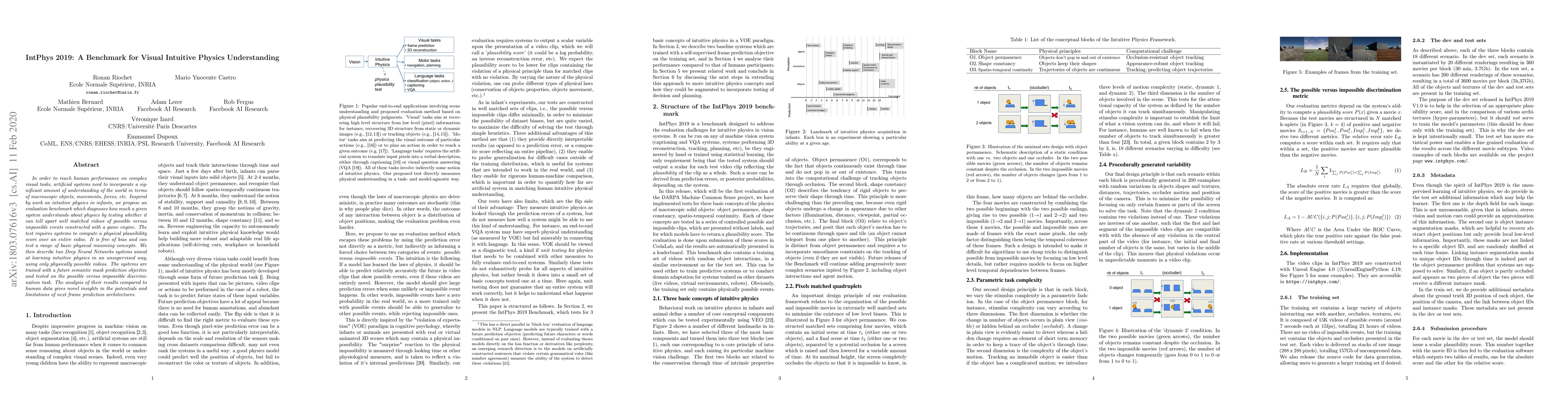 In order to reach human performance on complexvisual tasks, artificial systems need to incorporate a sig-nificant amount of understanding of the world in termsof macroscopic objects, movements, forces, etc. Inspiredby work on intuitive physics in infants, we propose anevaluation benchmark which diagnoses how much a givensystem understands about physics by testing whether itcan tell apart well matched videos of possible versusimpossible events constructed with a game engine. Thetest requires systems to compute a physical plausibilityscore over an entire video. It is free of bias and cantest a range of basic physical reasoning concepts. Wethen describe two Deep Neural Networks systems aimedat learning intuitive physics in an unsupervised way,using only physically possible videos. The systems aretrained with a future semantic mask prediction objectiveand tested on the possible versus impossible discrimi-nation task. The analysis of their results compared tohuman data gives novel insights in the potentials andlimitations of next frame prediction architectures.