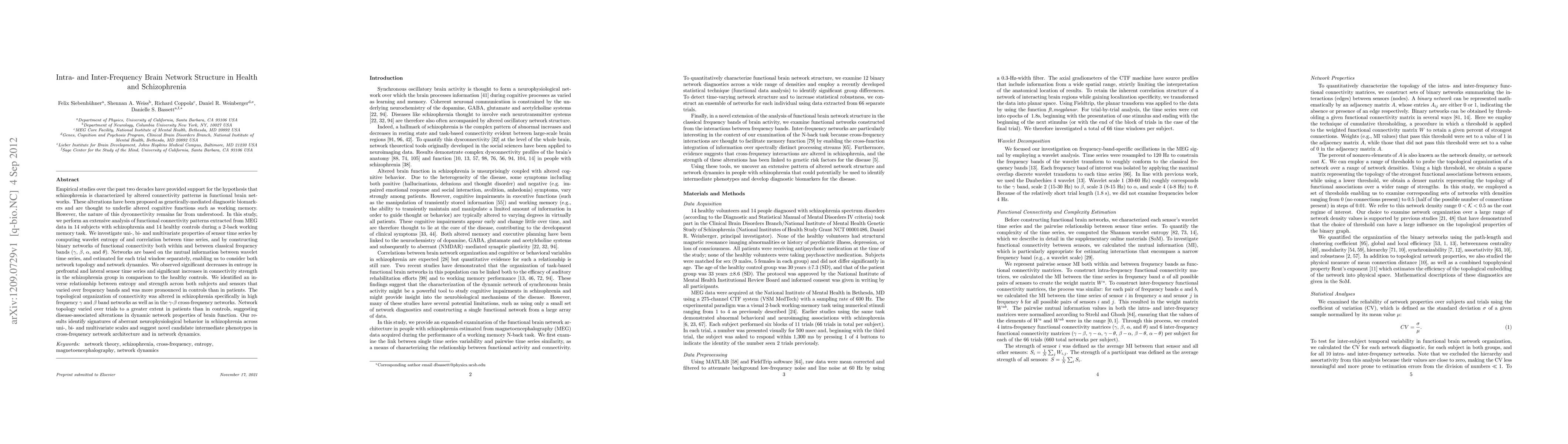 Empirical studies over the past two decades have supported the hypothesis that schizophrenia is characterized by altered connectivity patterns in functional brain networks. These alterations have been proposed as genetically-mediated diagnostic biomarkers and are thought to underlie altered cognitive functions such as working memory. In this study, we perform an extensive analysis of functional connectivity patterns extracted from MEG data in 14 subjects with schizophrenia and 14 healthy controls during a 2-back working memory task. We investigate uni-, bi- and multivariate properties of sensor time series by computing wavelet entropy of and correlation between time series, and by constructing binary networks of functional connectivity both within and between classical frequency bands (gamma, beta, alpha, and theta). Networks are based on the mutual information between wavelet time series, and estimated for 66 separate time windows. We observed decreases in entropy in prefrontal and lateral sensor time series and increases in connectivity strength in the schizophrenia group in comparison to the healthy controls. We identified an inverse relationship between entropy and strength across both subjects and sensors that varied over frequency bands and was more pronounced in controls than in patients. Brain network topology was altered in schizophrenia specifically in high frequency gamma and beta band networks as well as in the gamma-beta cross-frequency networks. Network topology varied over trials to a greater extent in patients than in controls, suggesting disease-associated alterations in dynamic network properties of brain function. Our results identify signatures of aberrant neurophysiological behavior in schizophrenia across uni-, bi- and multivariate scales and identify cross-frequency network architecture and network dynamics as candidate intermediate phenotypes.