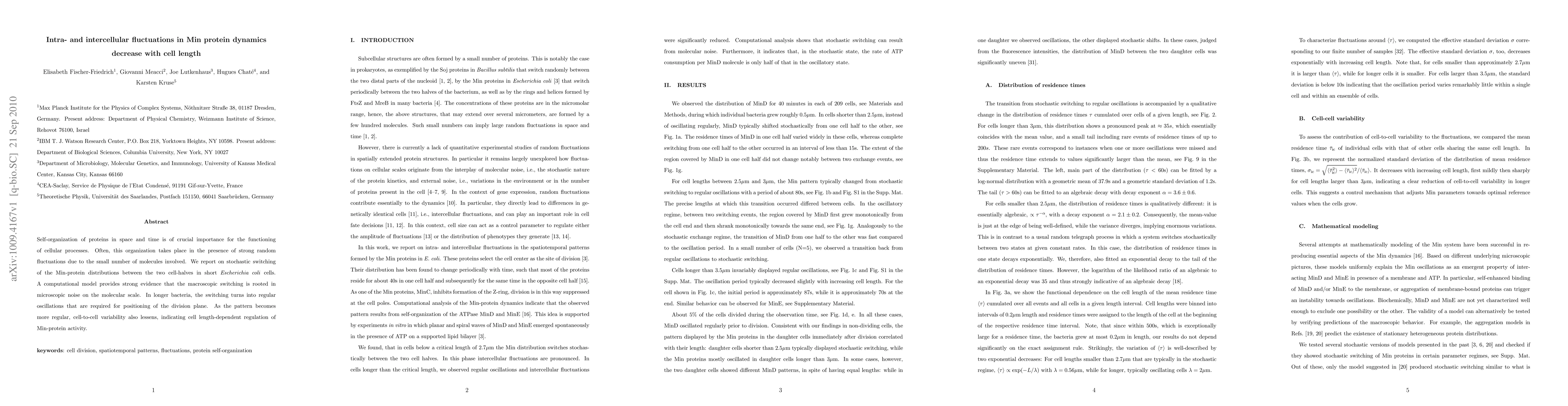 This study reveals that Min-protein dynamics in Escherichia coli cells exhibit stochastic switching in shorter cells, while longer cells show regular oscillations, suggesting length-dependent regulation that decreases variability with increased cell length. Computational modeling supports the idea that macroscopic switching behavior originates from microscopic molecular noise.