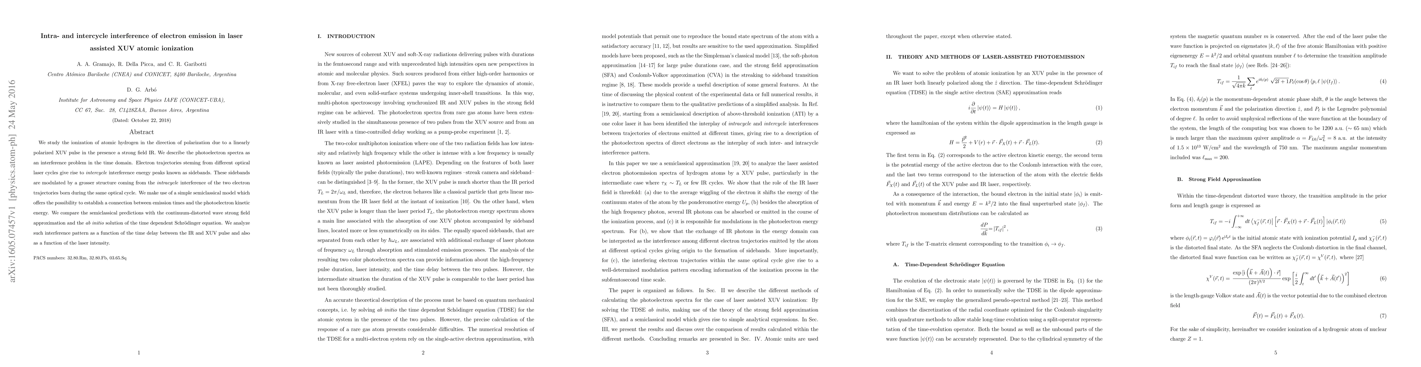 We study the ionization of atomic hydrogen in the direction of polarization due to a linearly polarized XUV pulse in the presence a strong field IR. We describe the photoelectron spectra as an interference problem in the time domain. Electron trajectories steming from different optical laser cycles give rise to intercycle interference energy peaks known as sidebands. These sidebands are modulated by a grosser structure coming from the intracycle interference of the two electron trajectories born during the same optical cycle. We make use of a simple semiclassical model which offers the possibility to establish a connection between emission times and the photoelectron kinetic energy. We compare the semiclassical predictions with the continuum-distorted wave strong field approximation and the ab initio solution of the time dependent Schr\"odinger equation. We analyze such interference pattern as a function of the time delay between the IR and XUV pulse and also as a function of the laser intensity.