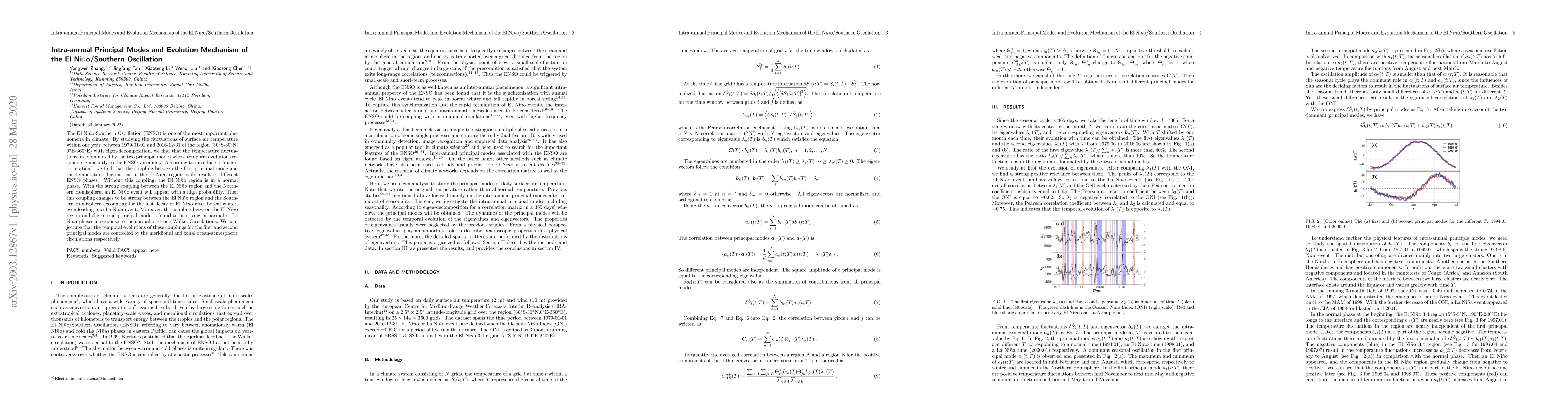 This paper investigates the intra-annual principal modes of surface air temperature fluctuations related to the El Nino-Southern Oscillation (ENSO) from 1979 to 2016. The study reveals that the first principal mode's coupling with the El Nino region influences ENSO phases, while the second principal mode's coupling with the region correlates with Walker Circulations, suggesting control by meridional and zonal ocean-atmospheric circulations.