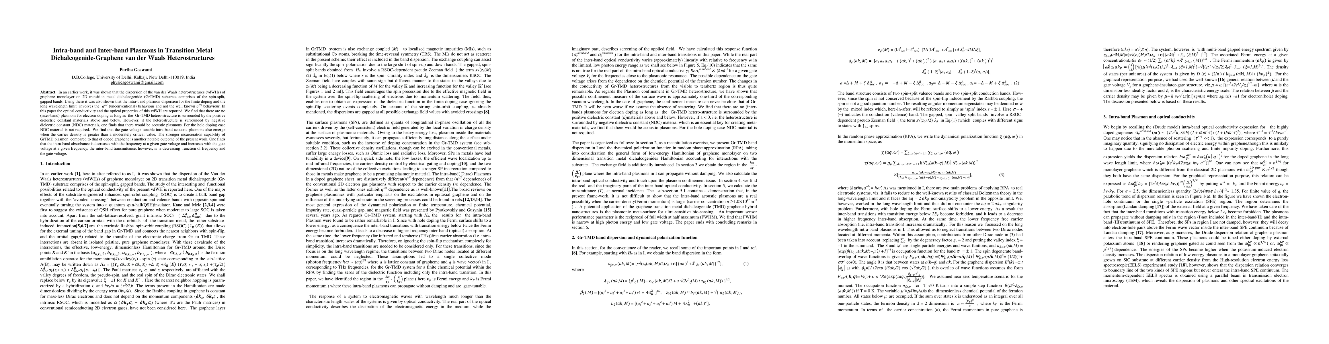 This paper investigates the optical conductivity and properties of van der Waals heterostructures combining graphene with transition metal dichalcogenides (GrTMD). It finds unconventional intra-band plasmons in the long wavelength limit and reveals that inter-band plasmons only exist when surrounded by negative dielectric constant materials, while intra-band plasmons are gate-voltage tunable and more effective than doped graphene.