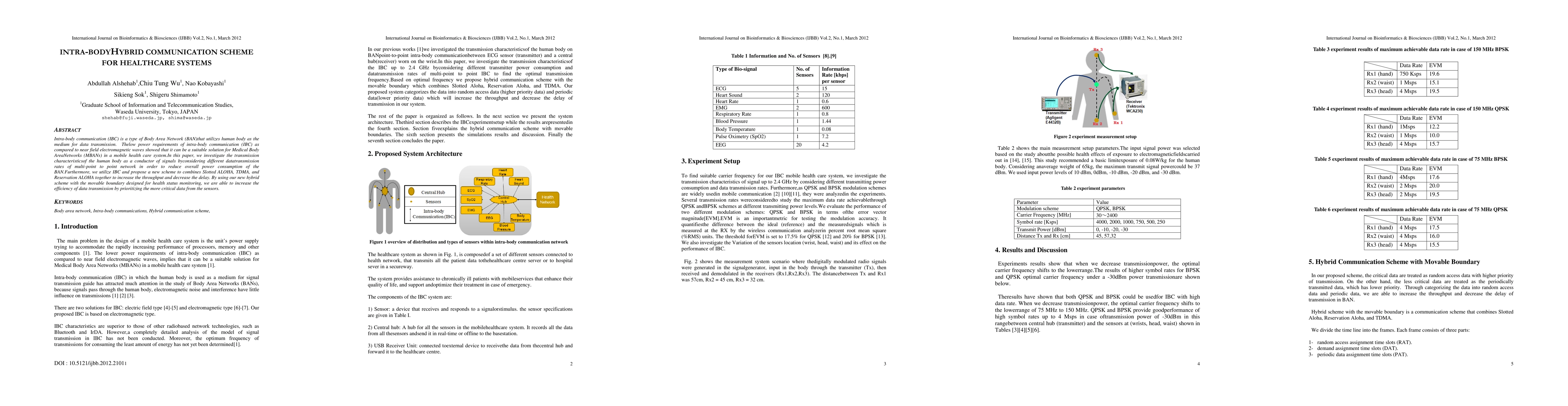 This paper proposes an intra-body hybrid communication scheme for healthcare systems that combines Slotted ALOHA, TDMA, and Reservation ALOHA to enhance throughput and reduce delay. The study investigates the human body's signal conduction properties to optimize power consumption in Medical Body Area Networks.