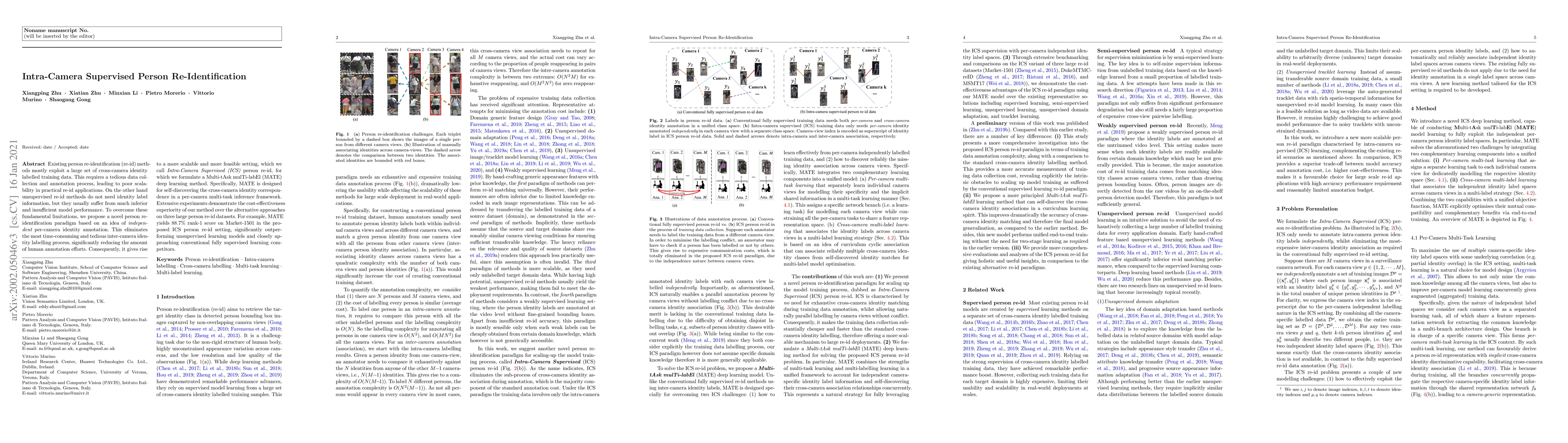 This paper proposes an Intra-Camera Supervised (ICS) person re-identification method that eliminates the need for inter-camera identity labels, significantly reducing annotation efforts. The MATE deep learning method achieves superior performance in a scalable setting, outperforming unsupervised models and approaching fully supervised methods, with a rank-1 score of 88.7% on Market-1501.