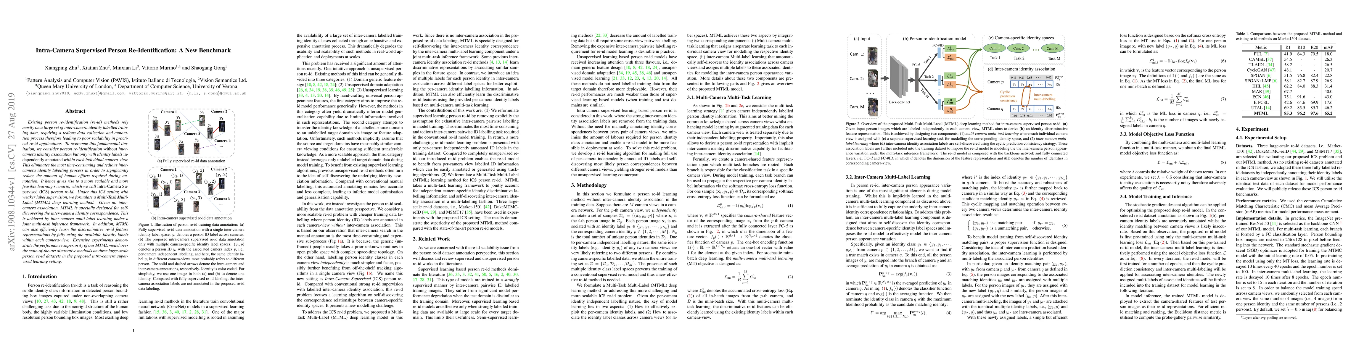 This paper proposes a new intra-camera supervised person re-identification method that eliminates the need for inter-camera identity labels, significantly reducing annotation effort. It introduces a Multi-Task Multi-Label deep learning model designed to discover inter-camera correspondences and learn discriminative features, demonstrating superior performance over existing methods.