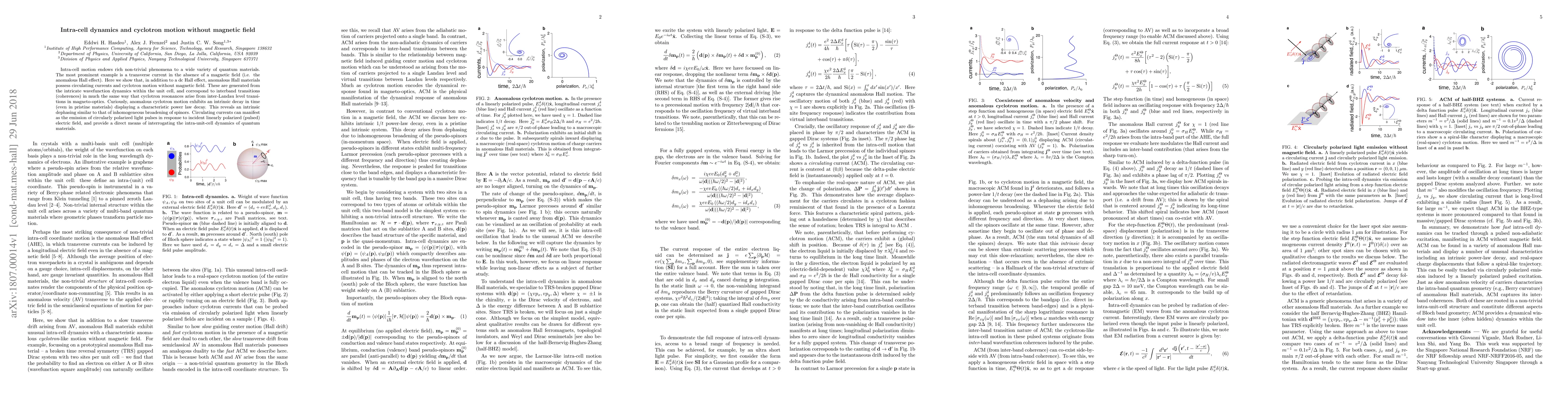 Intra-cell motion endows rich non-trivial phenomena to a wide variety of quantum materials. The most prominent example is a transverse current in the absence of a magnetic field (i.e. the anomalous Hall effect). Here we show that, in addition to a dc Hall effect, anomalous Hall materials possess circulating currents and cyclotron motion without magnetic field. These are generated from the intricate wavefunction dynamics within the unit cell, and correspond to interband transitions (coherences) in much the same way that cyclotron resonances arise from inter-Landau level transitions in magneto-optics. Curiously, anomalous cyclotron motion exhibits an intrinsic decay in time (even in pristine materials) displaying a characteristic power law decay. This reveals an intrinsic dephasing similar to that of inhomogeneous broadening of spinors. Circulating currents can manifest as the emission of circularly polarized light pulses in response to incident linearly polarized (pulsed) electric field, and provide a direct means of interrogating the intra-unit-cell dynamics of quantum materials.