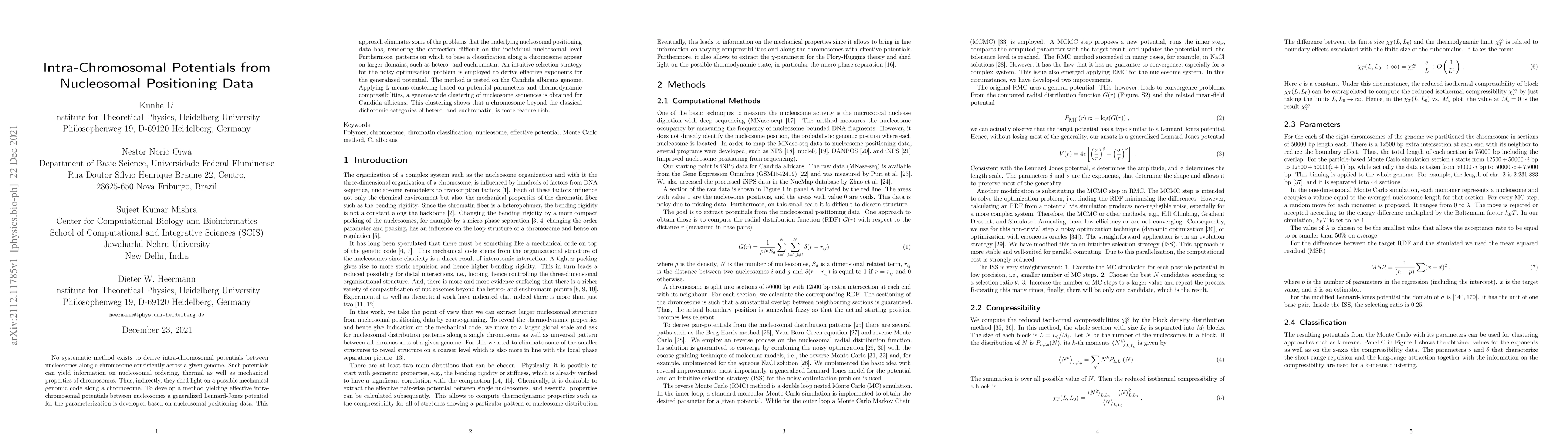 No systematic method exists to derive intra-chromosomal potentials between nucleosomes along a chromosome consistently across a given genome. Such potentials can yield information on nucleosomal ordering, thermal as well as mechanical properties of chromosomes. Thus, indirectly, they shed light on a possible mechanical genomic code along a chromosome. To develop a method yielding effective intra-chromosomal potentials between nucleosomes a generalized Lennard-Jones potential for the parameterization is developed based on nucleosomal positioning data. This approach eliminates some of the problems that the underlying nucleosomal positioning data has, rendering the extraction difficult on the individual nucleosomal level. Furthermore, patterns on which to base a classification along a chromosome appear on larger domains, such as hetero- and euchromatin. An intuitive selection strategy for the noisy-optimization problem is employed to derive effective exponents for the generalized potential. The method is tested on the Candida albicans genome. Applying k-means clustering based on potential parameters and thermodynamic compressibilities, a genome-wide clustering of nucleosome sequences is obtained for Candida albicans. This clustering shows that a chromosome beyond the classical dichotomic categories of hetero- and euchromatin, is more feature-rich.
