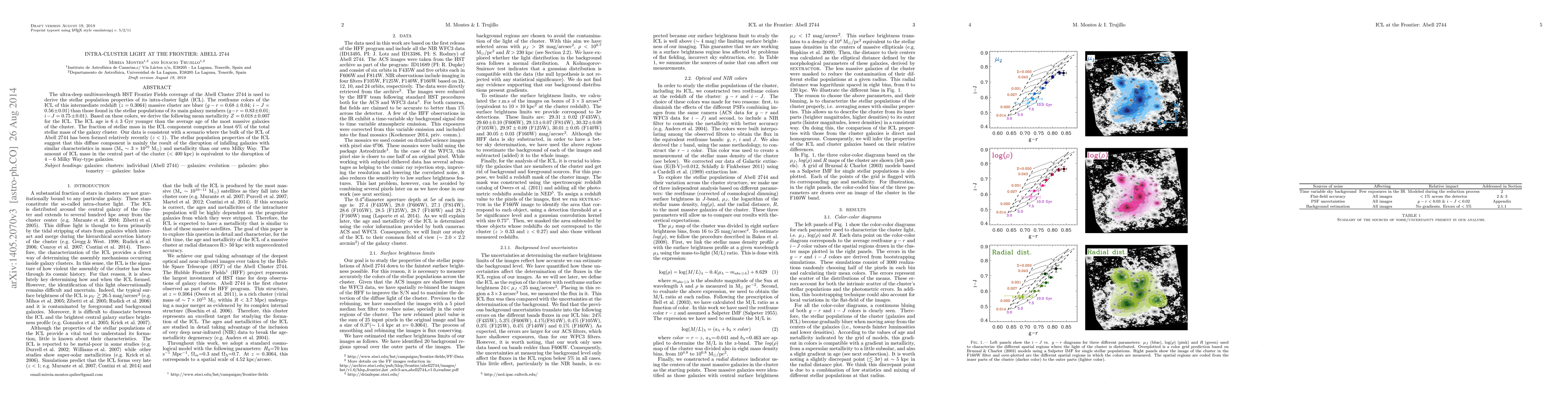 This study uses HST Frontier Fields data to analyze the intra-cluster light (ICL) of the Abell 2744 cluster, finding its stellar population is bluer and younger than the main galaxies, suggesting recent disruption of Milky Way-sized galaxies formed the ICL. The ICL constitutes at least 6% of the total stellar mass of the cluster.