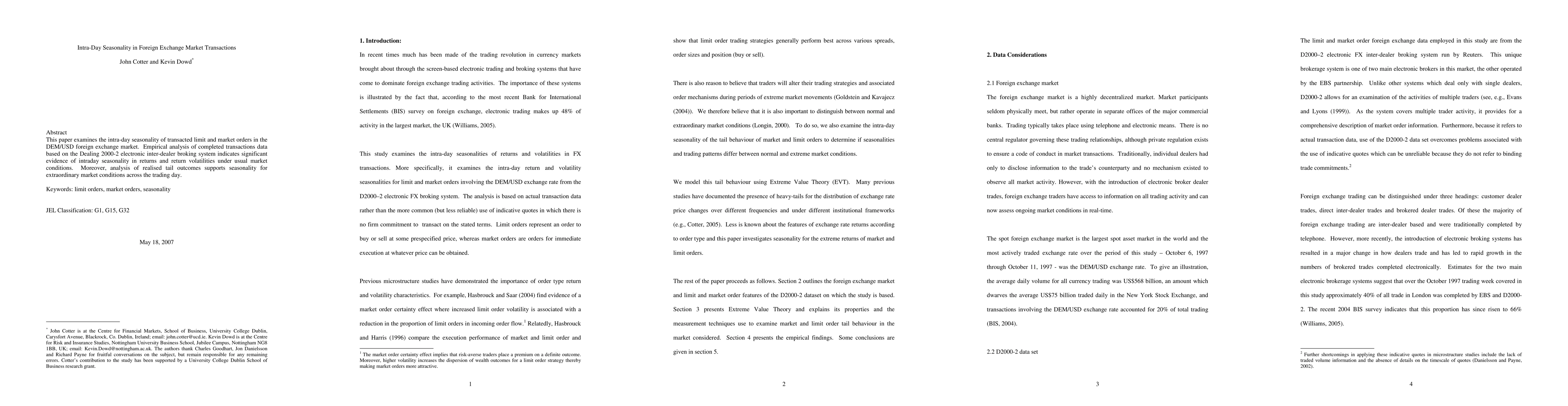 This paper investigates the intra-day seasonality in DEM/USD foreign exchange transactions, revealing significant intraday patterns in returns and volatility, and confirming these patterns during extraordinary market conditions. The study uses data from the Dealing 2000-2 electronic inter-dealer broking system.