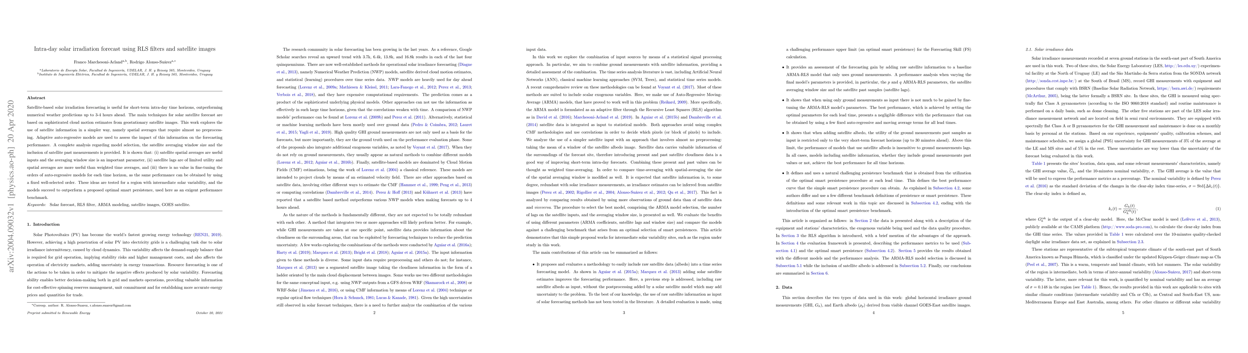 This paper explores intra-day solar irradiation forecasts using satellite spatial averages and RLS filters, demonstrating that simple averaging of satellite data outperforms traditional methods up to 4 hours ahead. The study finds that the averaging window size is crucial, while satellite lags are less useful, and a fixed model order works best.