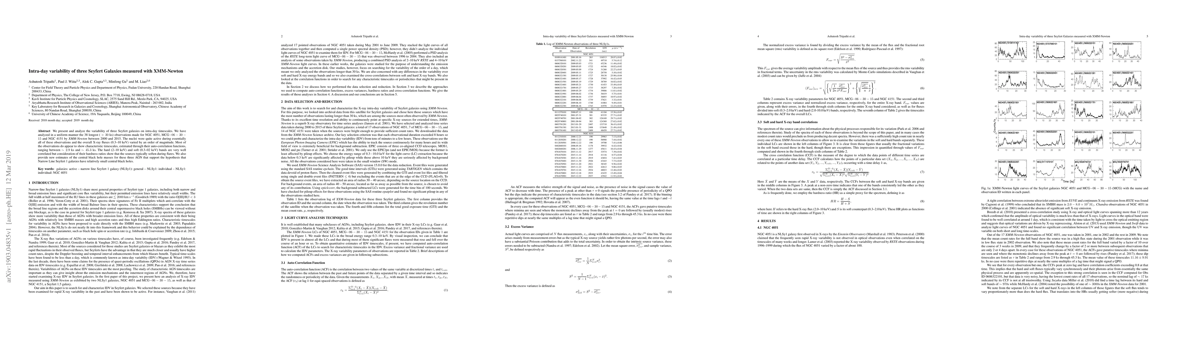 We present and analyze the variability of three Seyfert galaxies on intra-day timescales. We have analyzed in a uniform manner the 38 longest ( $>30$ ks) observations made for NGC 4051, MCG$-06-30-15$ and NGC 4151 by XMM-Newton between 2000 and 2015. The nuclei were quite active during essentially all of these observations and the overall X-ray fluxes (0.3-10 keV) varied by an order of magnitude. Most of the observations do appear to show characteristic timescales, estimated through their auto-correlation functions, ranging between $\sim 2.9$ ks and $\sim 45.3$ ks. The hard (2-10 keV) and soft (0.3-02 keV) bands are very well correlated but consideration of their hardness ratios show that the sources typically soften during flares. We also provide new estimates of the central black hole masses for these three AGN that support the hypothesis that Narrow Line Seyfert 1 galaxies have relatively small central black holes.