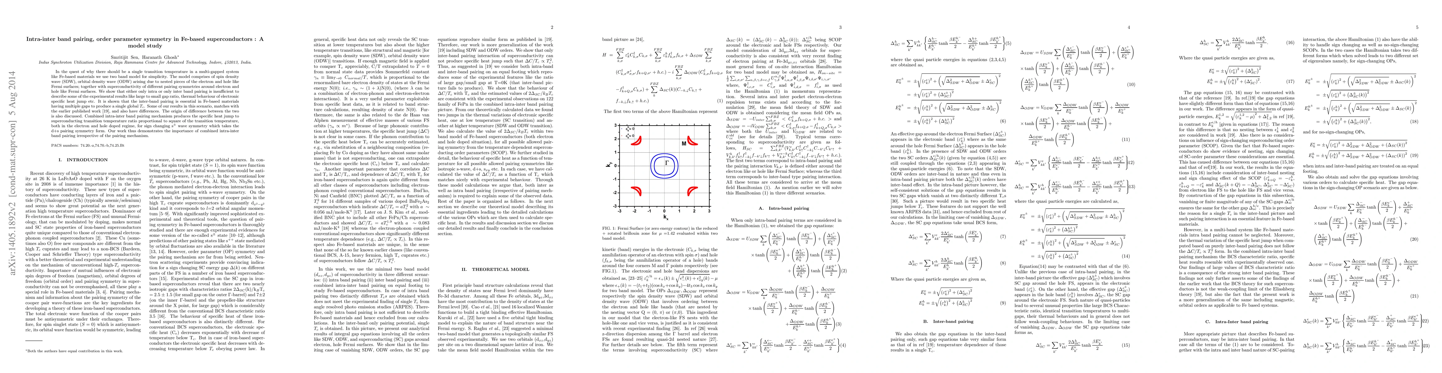 In the quest of why there should be a single transition temperature in a multi-gapped system like Fe-based materials we use two band model for simplicity. The model comprises of spin density wave (SDW), orbital density wave (ODW) arising due to nested pieces of the electron and hole like Fermi surfaces; together with superconductivity of different pairing symmetries around electron and hole like Fermi surfaces. We show that either only intra or only inter band pairing is insufficient to describe some of the experimental results like large to small gap ratio, thermal behaviour of electronic specific heat jump etc. It is shown that the inter-band pairing is essential in Fe-based materials having multiple gaps to produce a single global $T_c$. Some of our results in this scenario, matches with the earlier published work \cite{two-band-prb}, and also have differences. The origin of difference between the two is also discussed. Combined intra-inter band pairing mechanism produces the specific heat jump to superconducting transition temperature ratio proportional to square of the transition temperature, both in the electron and hole doped regime, for sign changing s$^{\pm}$ wave symmetry which takes the d+s pairing symmetry form. Our work thus demonstrates the importance of combined intra-inter band pairing irrespective of the pairing mechanism.