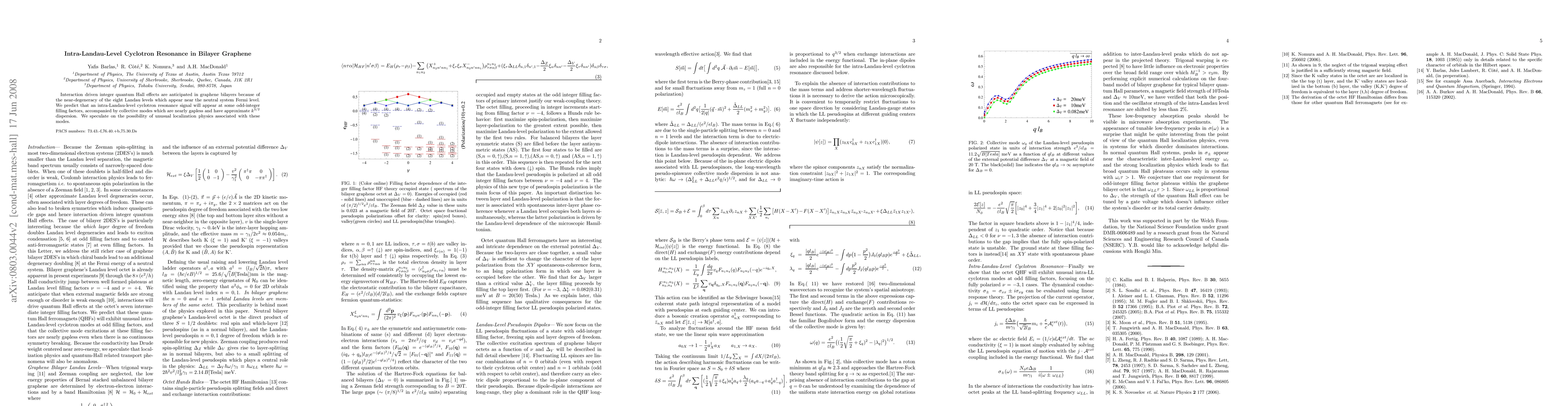 Summary: This research predicts an intra-Landau-level cyclotron resonance in bilayer graphene, suggesting collective, nearly gapless modes with $k^{3/2}$ dispersion at odd-integer filling factors, potentially linked to unique localization phenomena.