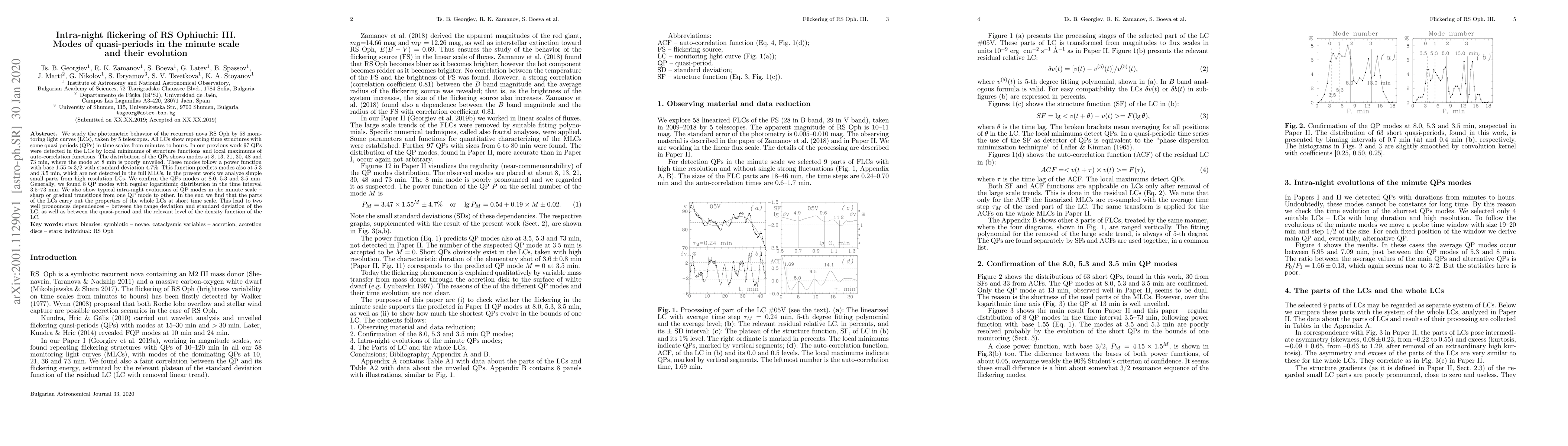 We study the photometric behavior of the recurrent nova RS Oph by 58 monitoring light curves (LCs), taken by 5 telescopes. All LCs show repeating time structures with some quasi-periods (QPs) in time scales from minutes to hours. In our previous work 97 QPs were detected in the LCs by local minimums of structure functions and local maximums of auto-correlation functions. The distribution of the QPs shows modes at 8, 13, 21, 30, 48 and 73 min, where the mode at 8 min is poorly unveiled. These modes follow a power function with base $1.55\approx 3/2$ with standard deviation 4.7%. This function predicts modes also at 5.3 and 3.5 min, which are not detected in the full MLCs. In the present work we analyze simple small parts from high resolution LCs. We confirm the QPs modes at 8.0, 5.3 and 3.5 min. Generally, we found 8 QP modes with regular logarithmic distribution in the time interval 3.5-73 min. We also show typical intra-night evolutions of QP modes in the minute scale -- sharp or gradual transitions from one QP mode to other. In the end we find that the parts of the LCs carry out the properties of the whole LCs at short time scale. This lead to two well pronounces dependences - between the range deviation and standard deviation of the LC, as well as between the quasi-period and the relevant level of the density function of the LC.